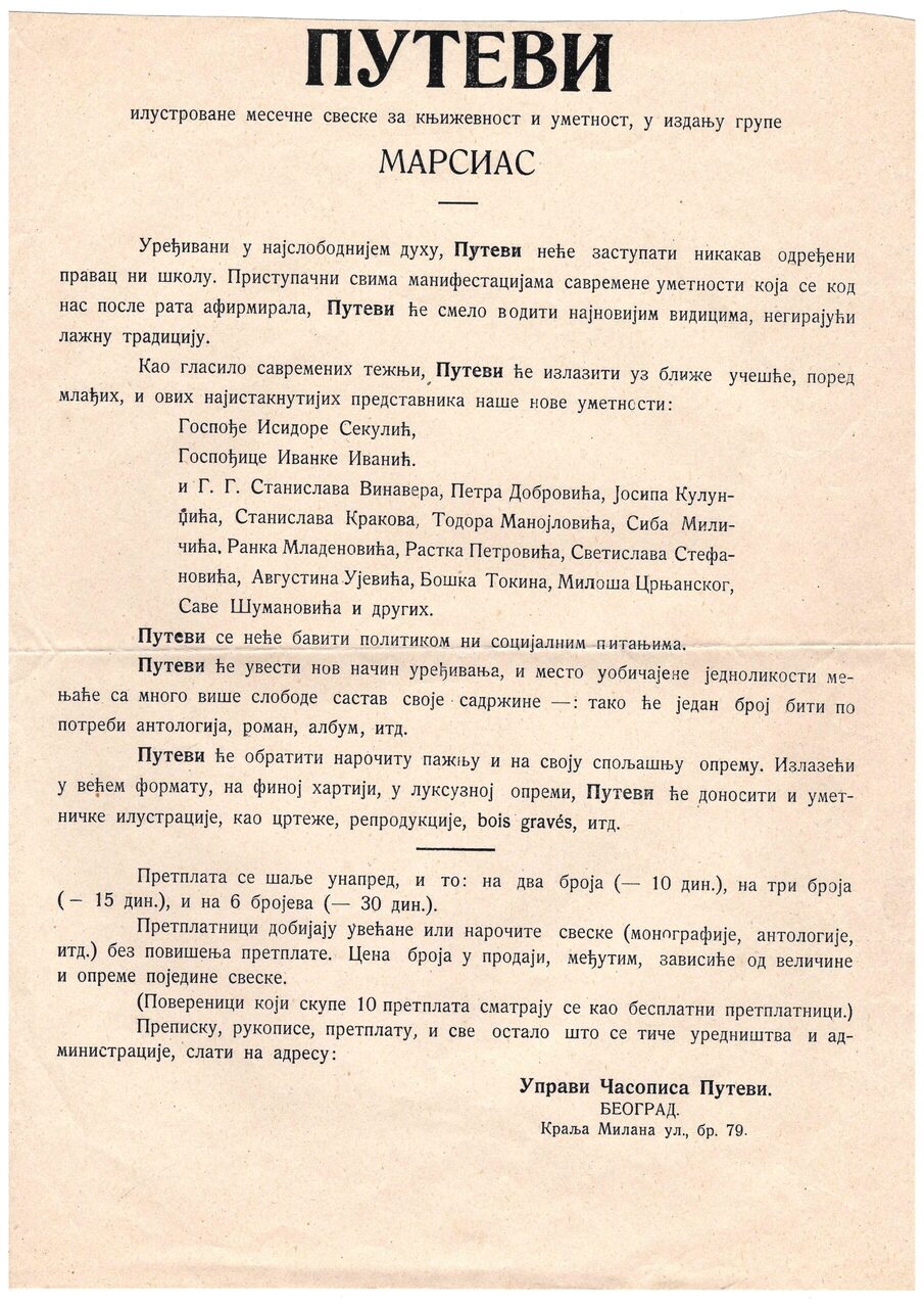 The surrealist movement had an international character – it developed in Belgium, Spain, Czechoslovakia, England, Switzerland, Portugal, Germany, and also in other continents; however, from the very beginning it was present in Serbia. The major part of the movement outside France was active only after 1930, while the French and Serbian surrealists developed synchronically for a whole decade between 1922 and 1932. The evolution of surrealist thought from Dadaism in France, and pre-surrealist phase in the local, developing-modernist context, just as the flow of radical ideas from the Parisian centre to Yugoslav periphery, one can simultaneously follow in the magazine Littérature (1919-1924) and Putevi (1922-1924), where future surrealists were both editors and contributors.