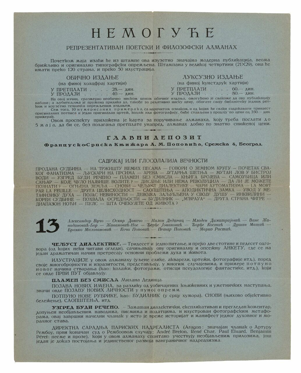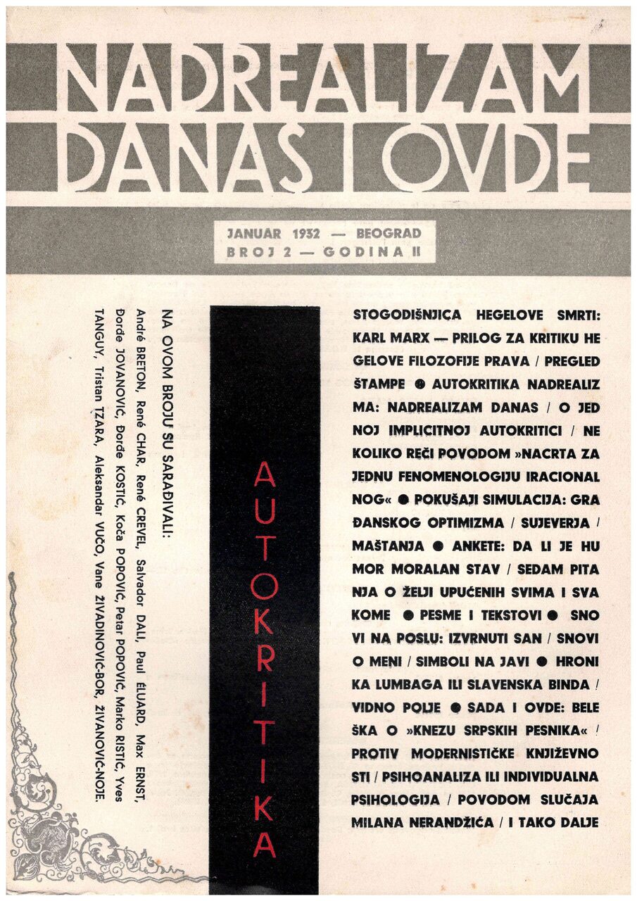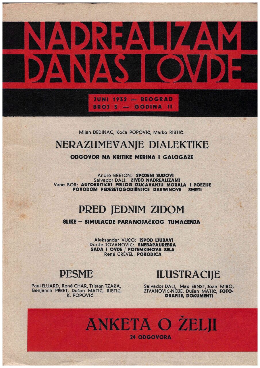 Their joint activities in Belgrade were made official with the publication of the text “with the meaning of a real manifesto” in the daily Politika on 14 April 1930. The group consisted of thirteen surrealists: Marko Ristić, Milan Dedinac, Mladen Dimitrijević, Dušan Matić, Vane Živadinović-Bor, Konstantin Koča Popović, Petar Popović, Radojica Živanović-Noe, Branko Milovanović, Aleksandar Vučo, Đorđe Kostić, Đorđe Jovanović and Oskar Davičo. The foundation was followed by an almanac in two languages Nemoguće – L’Impossible, while the text about the foundation of the Belgrade group was translated and published in the French journal Le Surréalisme au service de la révolution (1930-1933); this officially represented the group in France. Although there was only one issue of the almanac, the joint venture was continued through the paper Nadrealizam danas i ovde (NDIO – Surrealism Today and Here).