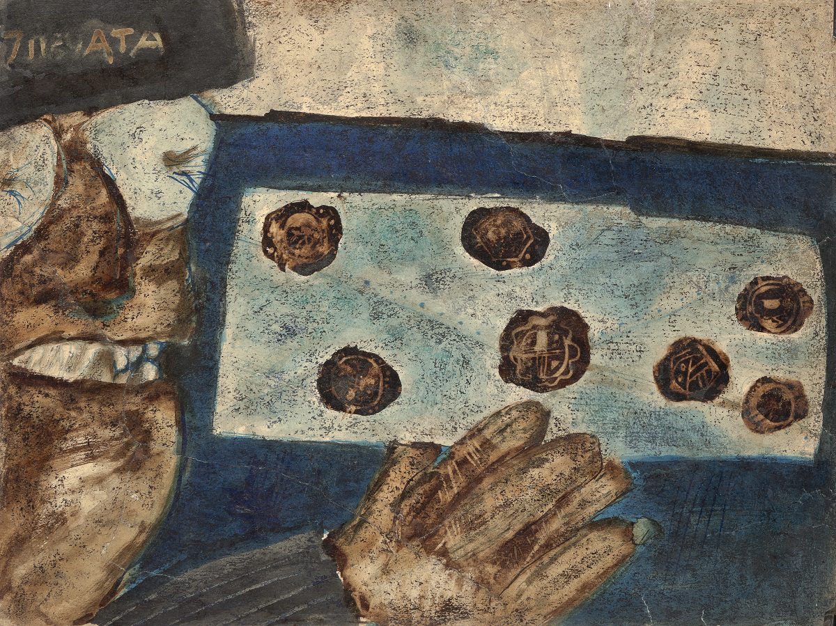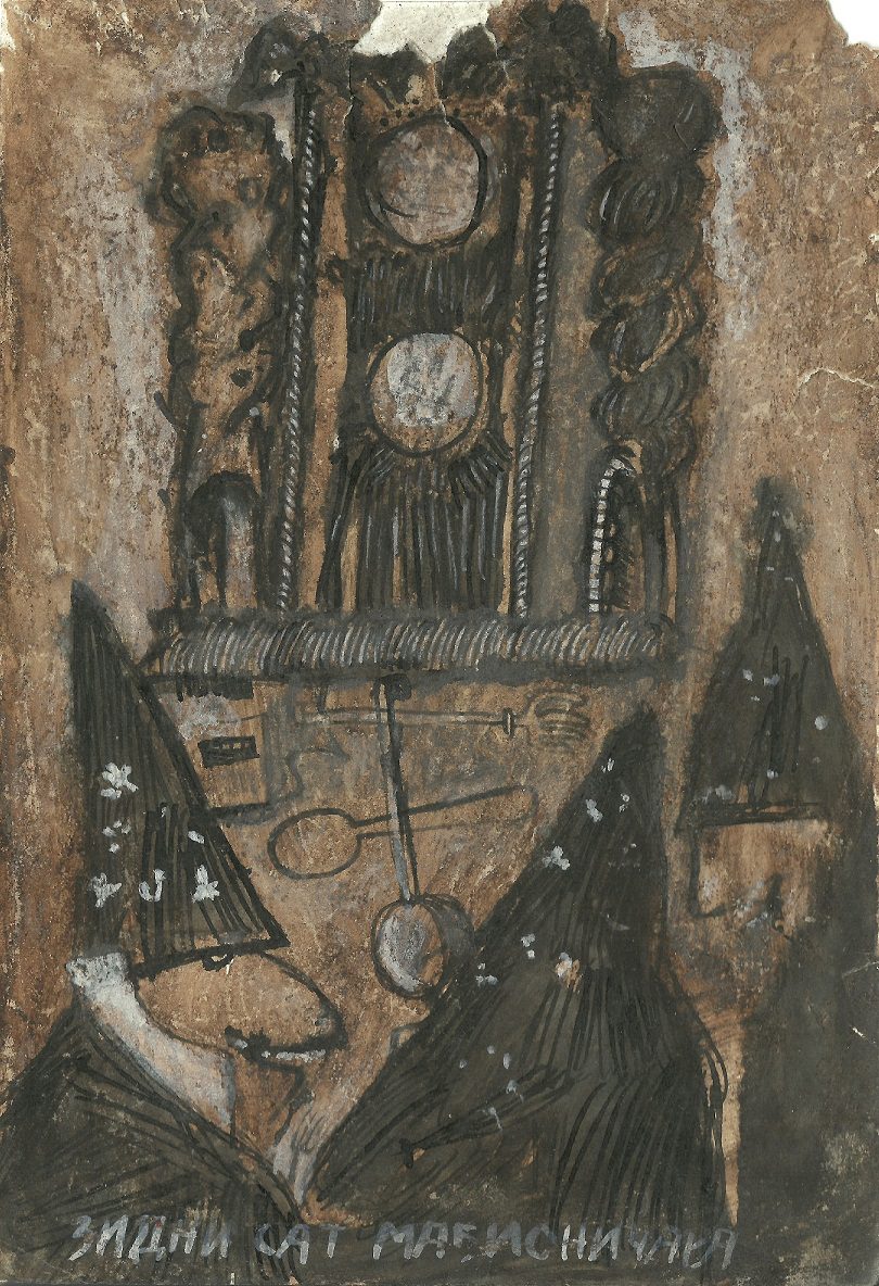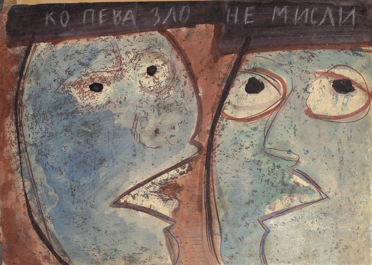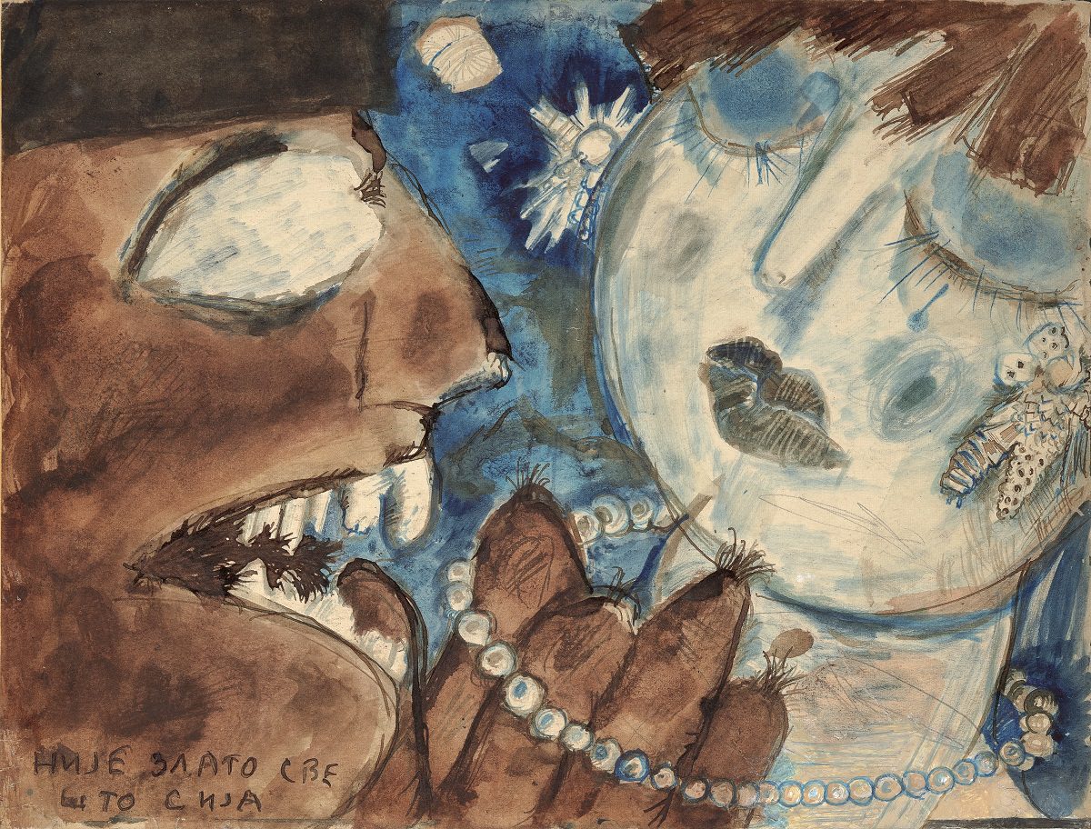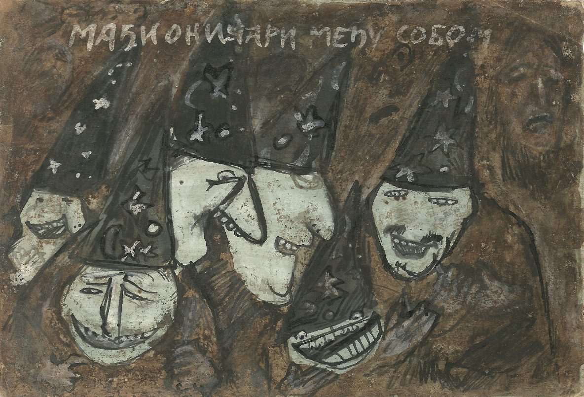 At the exhibition in the Rima Gallery, with only a few exceptions, there will be shown for the first time his small format works on paper, seriously damaged but subsequently restored exceptionally well so that they can now be definitely included into the artist’s overall opus. Their titles are: Tomorrow Will Be Too Late (self–portrait), Everyman for Himself, Sour Puss Magicians dated on the back 23 XI 51. Then there are Orator’s Gesture, A Big Bite, Voice, Syringe, The Spring Is Springing Forth, Seven Seals, Underlined, Wake, Dok…(incomplete title), Now I Am Alone, All That Glitters Is Not Gold, Unnecessary Harshness, Cross, An Honest Man, Tears, Useful Trick, Lapsus Lingue, A Merry Heart Bears No Evil, At the Same Task, Proverb I, Proverb II; all the titles are written in big Cyrillic letters over the scene and there are some untitled ones. They all belong to the artist’s early Belgrade period from about 1950 to 1953, to the cycles of Proverbs and Magicians or to the works made at the same time and related to them, with all the characteristics of thematic and visual features of those cycles, confirming and enhancing the appraisals of Jovanović’s art from its Belgrade beginnings and his first shows from 1953 supported by Zoran Mišić and Vasko Popa in their catalogue prefaces.