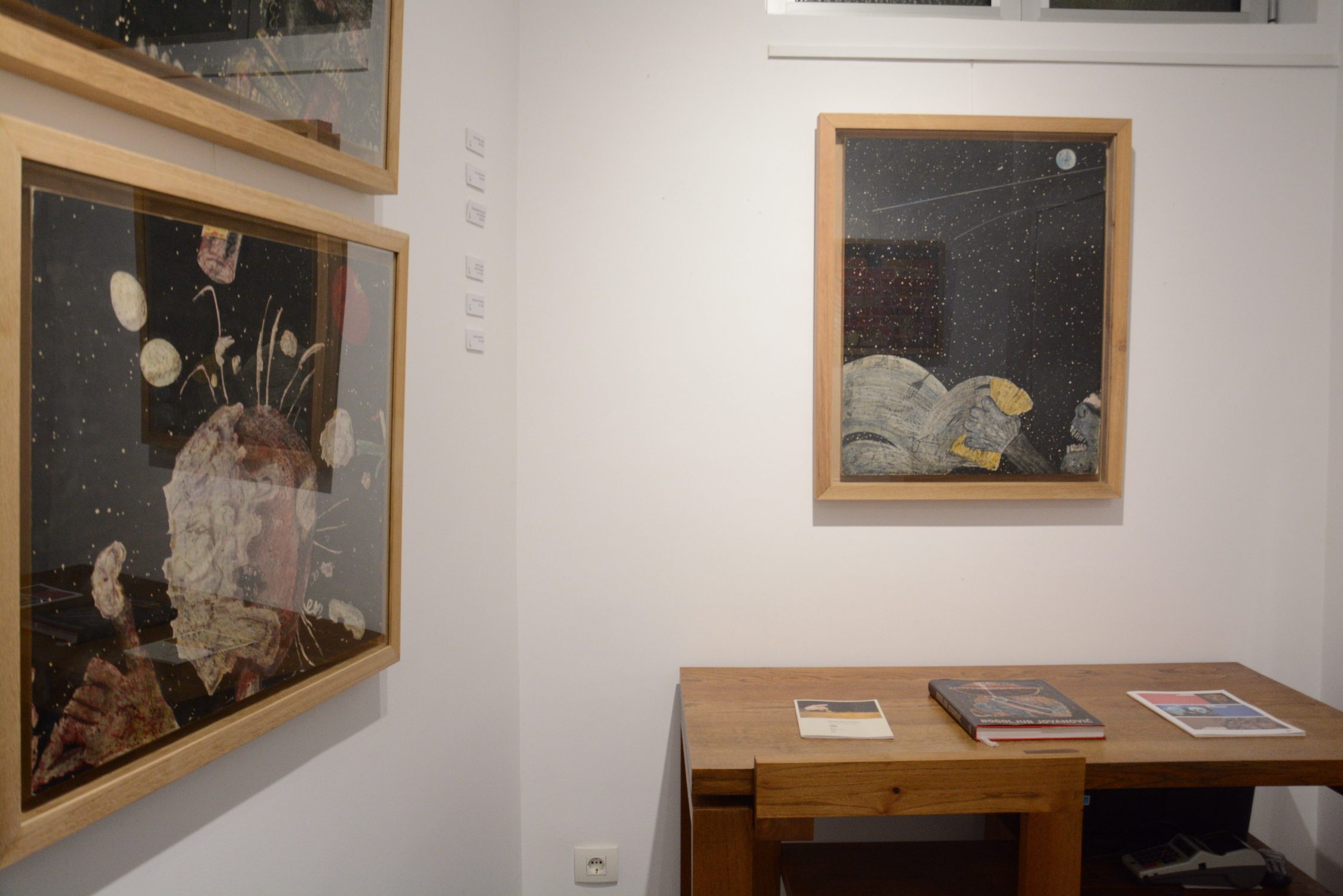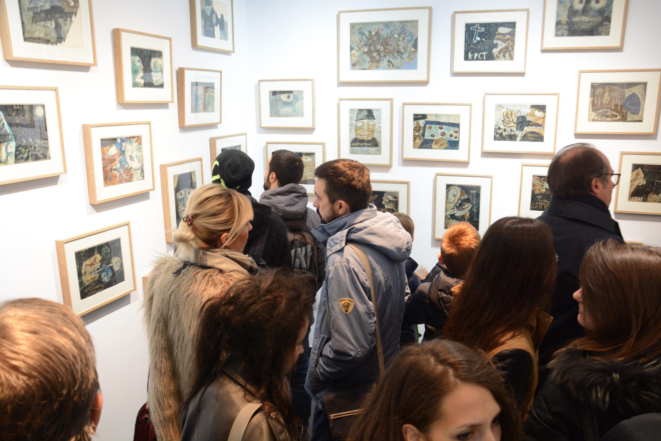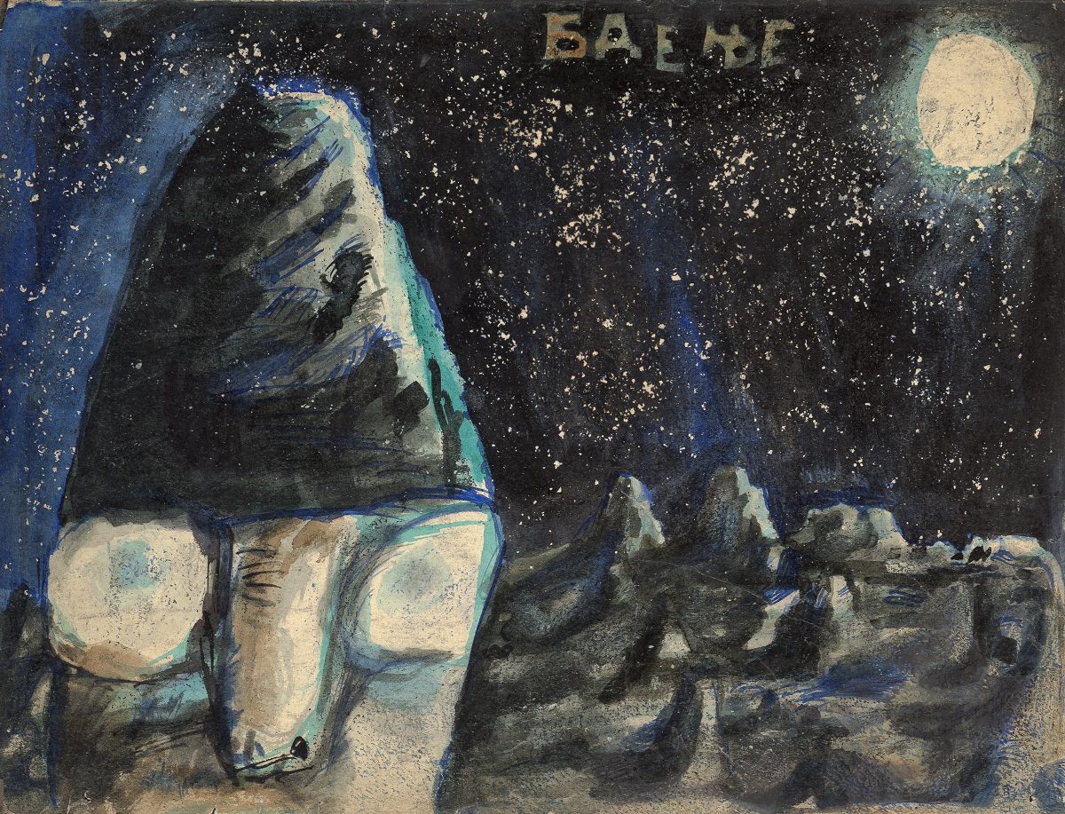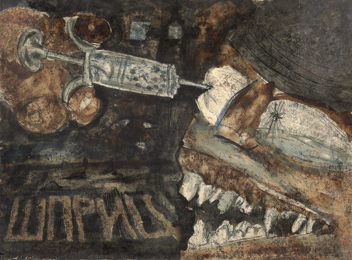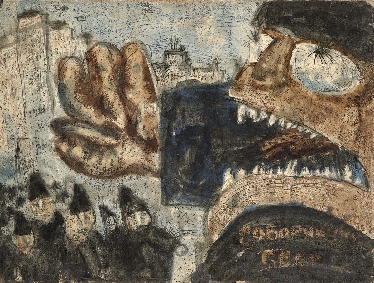 At the exhibition in the Rima Gallery, with only a few exceptions, there will be shown for the first time his small format works on paper, seriously damaged but subsequently restored exceptionally well so that they can now be definitely included into the artist’s overall opus. Their titles are: Tomorrow Will Be Too Late (self–portrait), Everyman for Himself, Sour Puss Magicians dated on the back 23 XI 51. Then there are Orator’s Gesture, A Big Bite, Voice, Syringe, The Spring Is Springing Forth, Seven Seals, Underlined, Wake, Dok…(incomplete title), Now I Am Alone, All That Glitters Is Not Gold, Unnecessary Harshness, Cross, An Honest Man, Tears, Useful Trick, Lapsus Lingue, A Merry Heart Bears No Evil, At the Same Task, Proverb I, Proverb II; all the titles are written in big Cyrillic letters over the scene and there are some untitled ones. They all belong to the artist’s early Belgrade period from about 1950 to 1953, to the cycles of Proverbs and Magicians or to the works made at the same time and related to them, with all the characteristics of thematic and visual features of those cycles, confirming and enhancing the appraisals of Jovanović’s art from its Belgrade beginnings and his first shows from 1953 supported by Zoran Mišić and Vasko Popa in their catalogue prefaces.