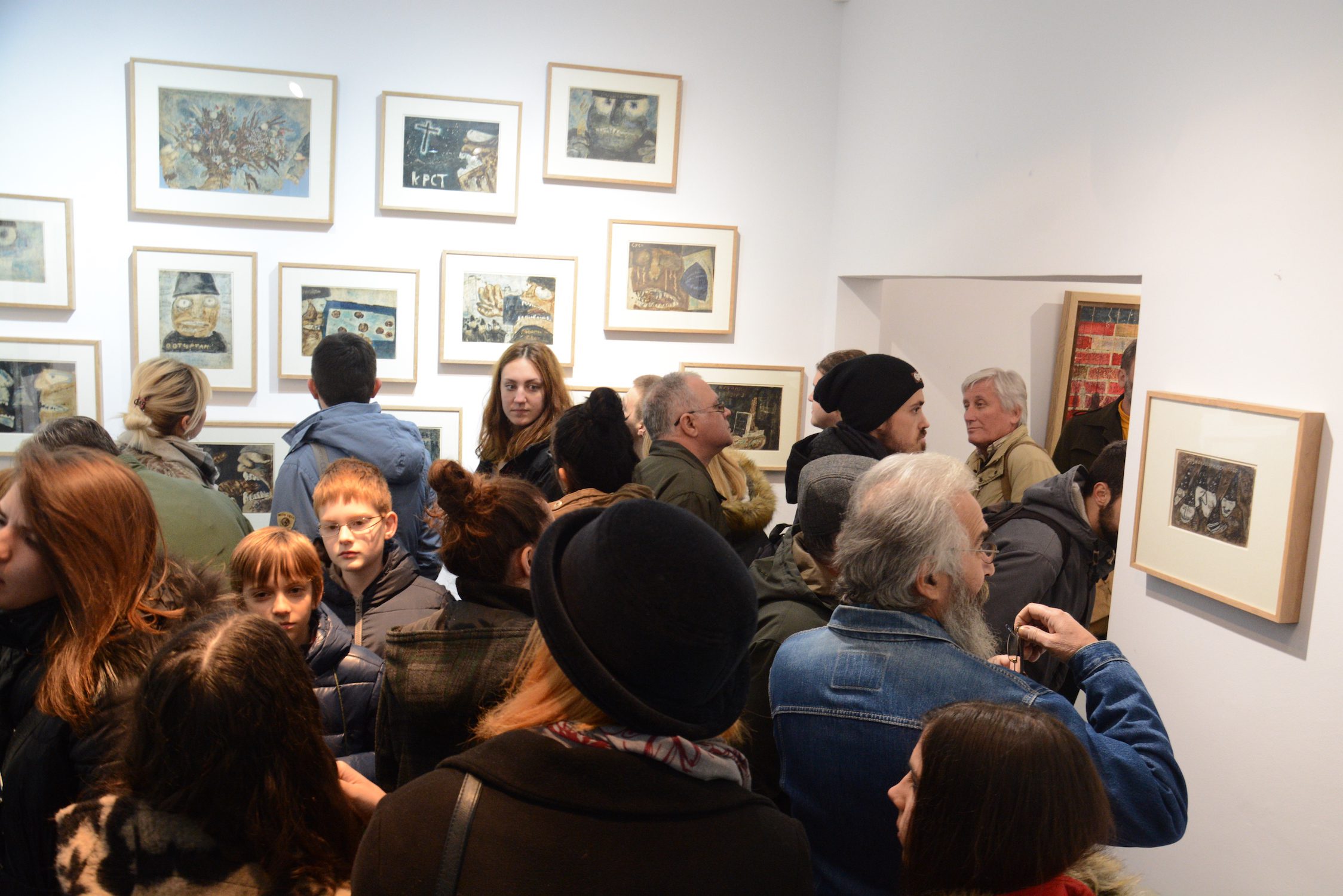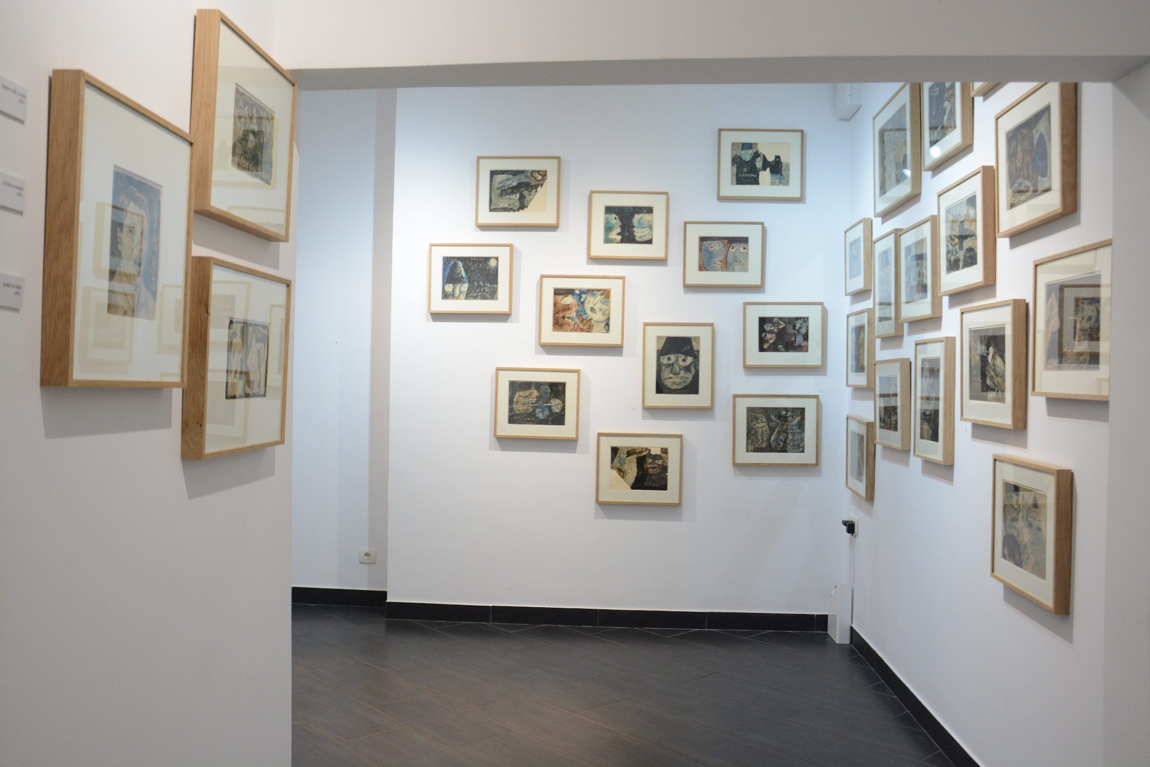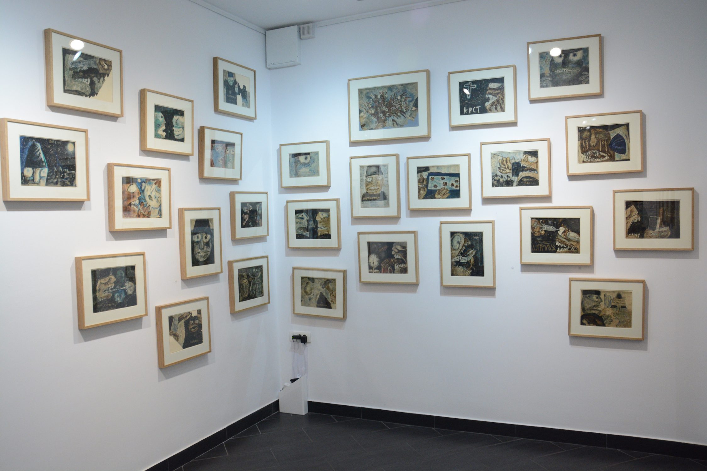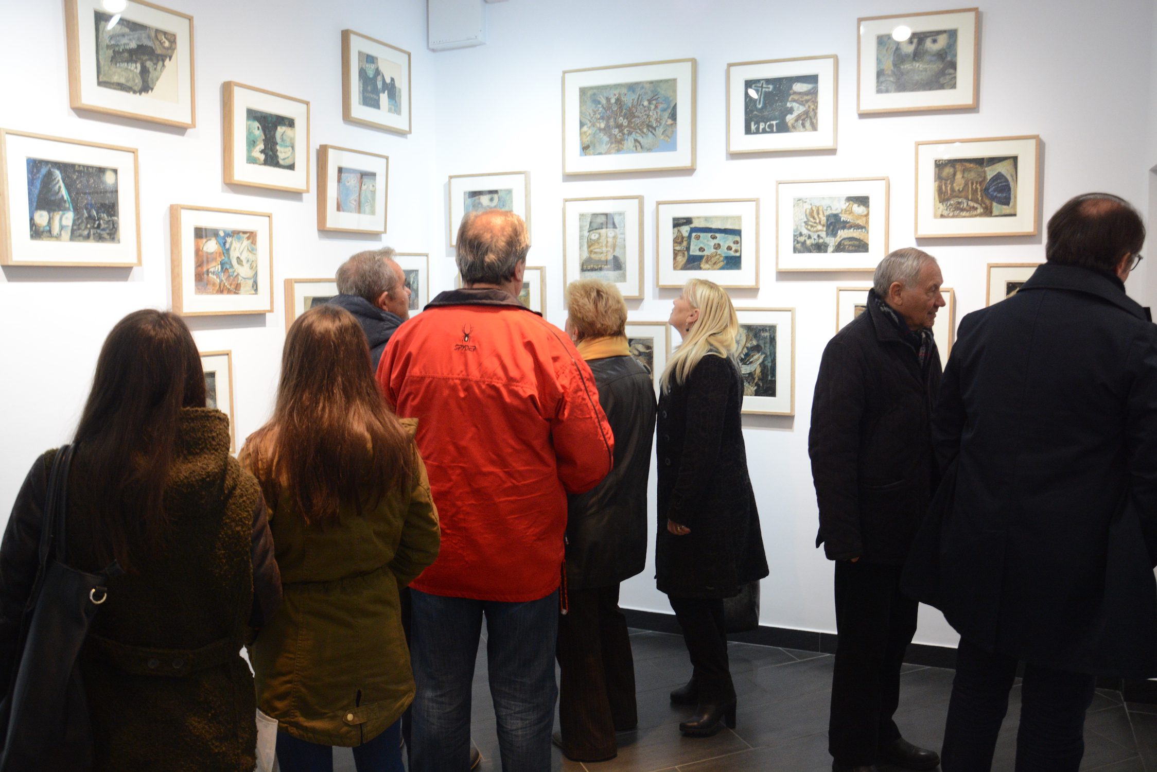 At the exhibition in the Rima Gallery, with only a few exceptions, there will be shown for the first time his small format works on paper, seriously damaged but subsequently restored exceptionally well so that they can now be definitely included into the artist’s overall opus. Their titles are: Tomorrow Will Be Too Late (self–portrait), Everyman for Himself, Sour Puss Magicians dated on the back 23 XI 51. Then there are Orator’s Gesture, A Big Bite, Voice, Syringe, The Spring Is Springing Forth, Seven Seals, Underlined, Wake, Dok…(incomplete title), Now I Am Alone, All That Glitters Is Not Gold, Unnecessary Harshness, Cross, An Honest Man, Tears, Useful Trick, Lapsus Lingue, A Merry Heart Bears No Evil, At the Same Task, Proverb I, Proverb II; all the titles are written in big Cyrillic letters over the scene and there are some untitled ones. They all belong to the artist’s early Belgrade period from about 1950 to 1953, to the cycles of Proverbs and Magicians or to the works made at the same time and related to them, with all the characteristics of thematic and visual features of those cycles, confirming and enhancing the appraisals of Jovanović’s art from its Belgrade beginnings and his first shows from 1953 supported by Zoran Mišić and Vasko Popa in their catalogue prefaces.