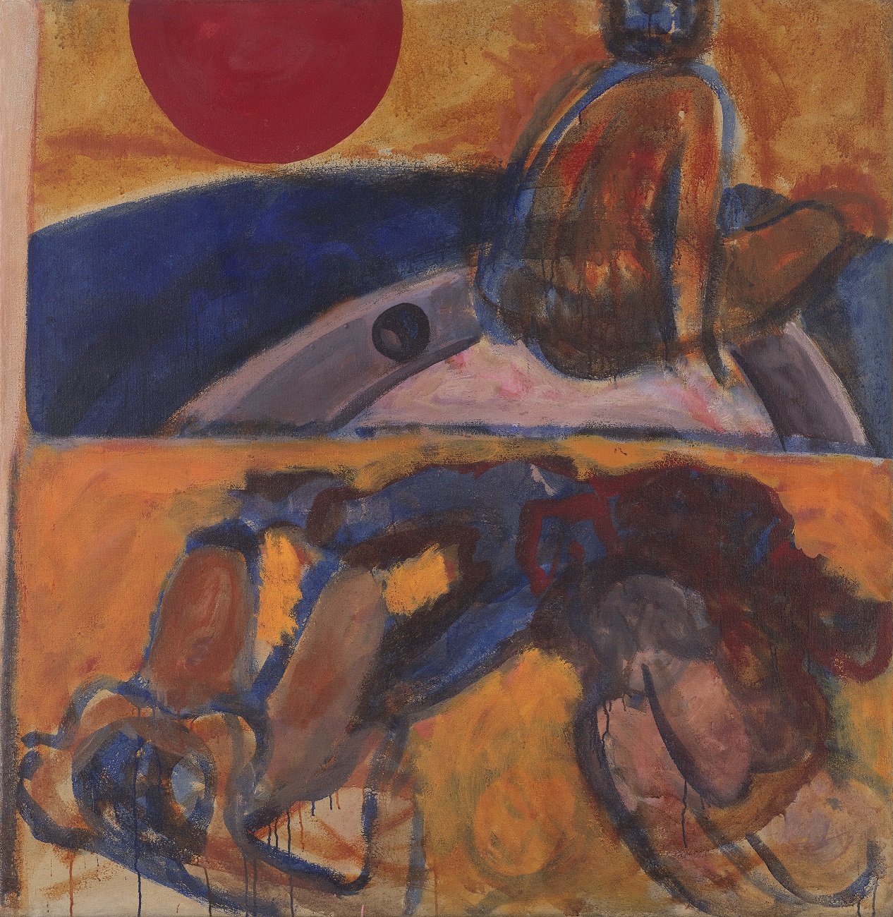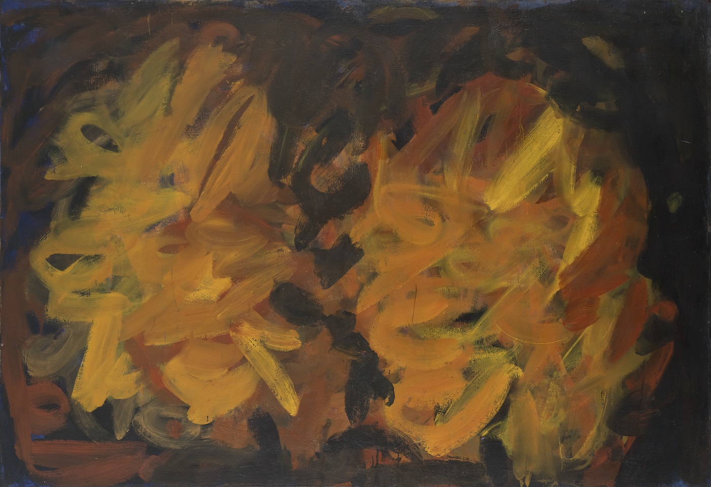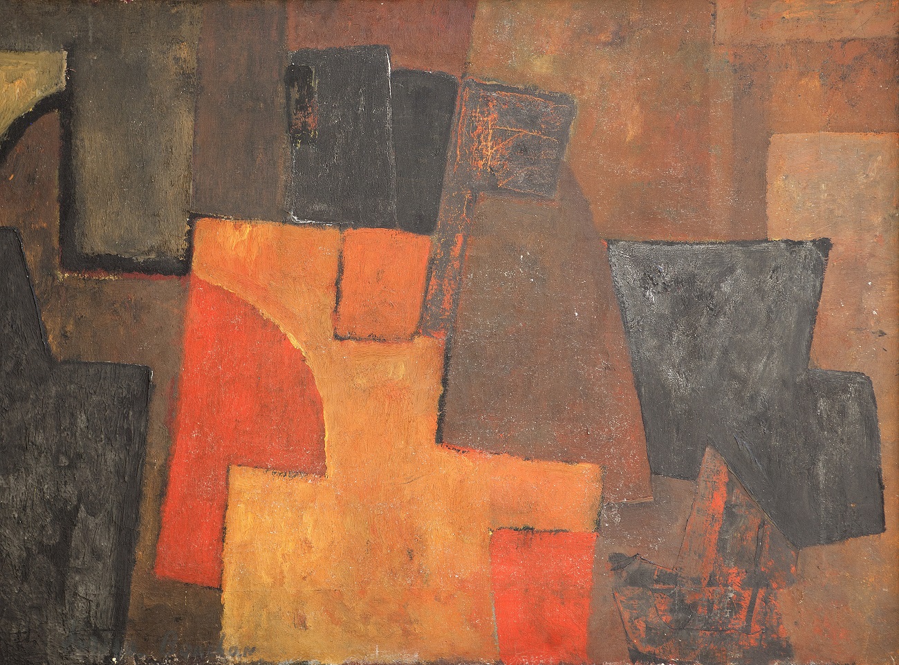 Only two years after their arrival in Paris, Kosa’s painting Orange Abstraction (1954) was shortlisted for Prix de Dôme and was shown at the exhibition organised in that legendary meeting point of artists in Montparnasse. The path from a traditional landscape and portrait to a painting formally devoid of all referential points to the outer world, led, in case of Kosa Bokšan, first through the painting of moderate geometrisation. It was the middle line of abstraction, between the “painting of French tradition” and the new phenomena of lyrical abstraction and informel. The compositions containing geometricized areas executed in thick or layered pigment, where the strokes and/or physical characteristics of the painted matter remained visible – synthesized certain qualities of the old and new models of abstract painting. Kosa could have seen exceptional examples of this kind of painting in the works of Serge Poliakoff who lived in the same hotel with her and Omčikus and exhibited in Gallery Jeanne Bucher, where they used to go often and became friends with some of the artists who gathered there. For an artist who suddenly entered the world of abstraction from the world of representational painting, this model of plastic thinking was relatively attractive because it offered the possibility of objective departures and nourished the elements of form and composition. Still, judging by the titles of Kosa’s early abstract paintings, to which her Composition and Orange Abstraction belong, it was clear that she had been liberated from non-painterly references by defining the content exclusively by plastic elements and their pure relations – the surface, colour and the line. Those were the works which, notwithstanding their closeness to the works by Poliakoff from the same years, demonstrated an absolute understanding of one model of painterly abstraction and her mature realisation of all of its segments. Anyway, her participation at the exhibition in the café La Dôme was an aspect of official recognition of Kosa’s mastering of the autonomous world of painting and also her full integration into the developments of the contemporary Parisian scene.