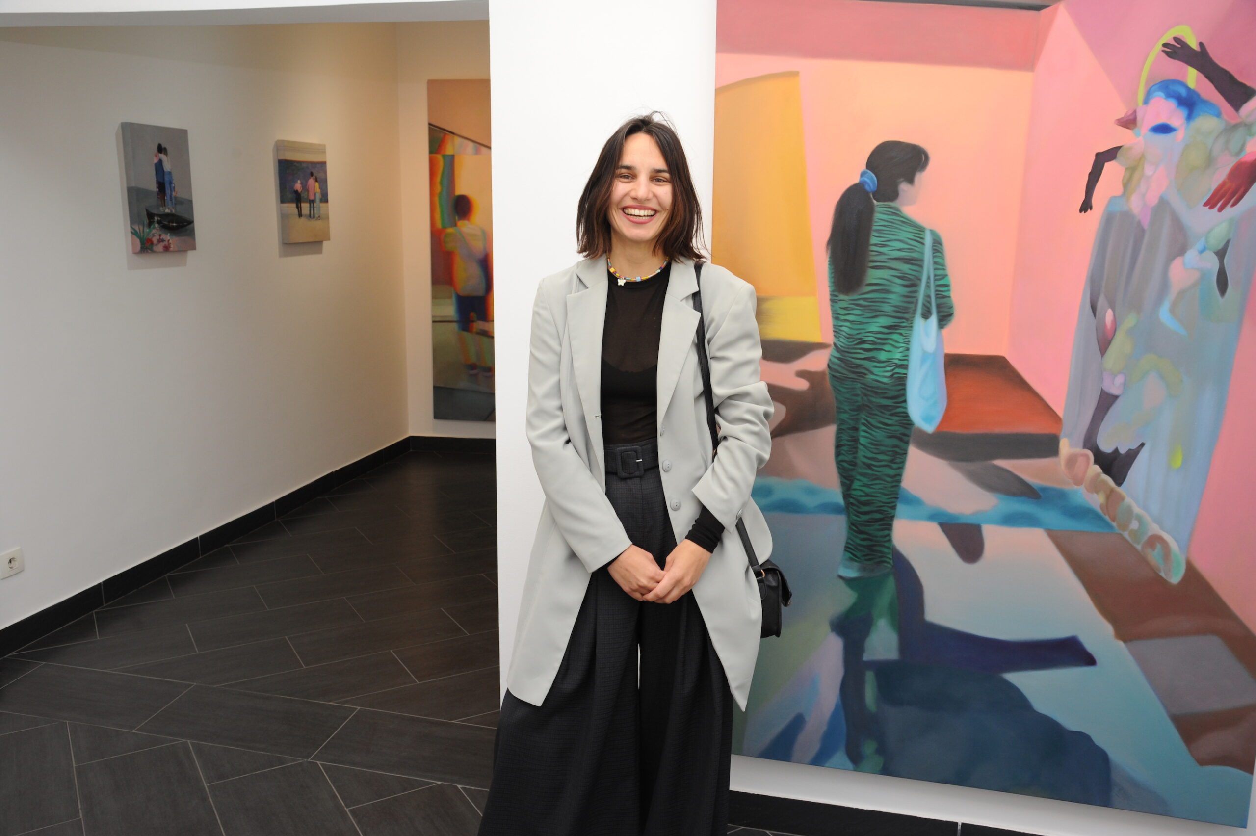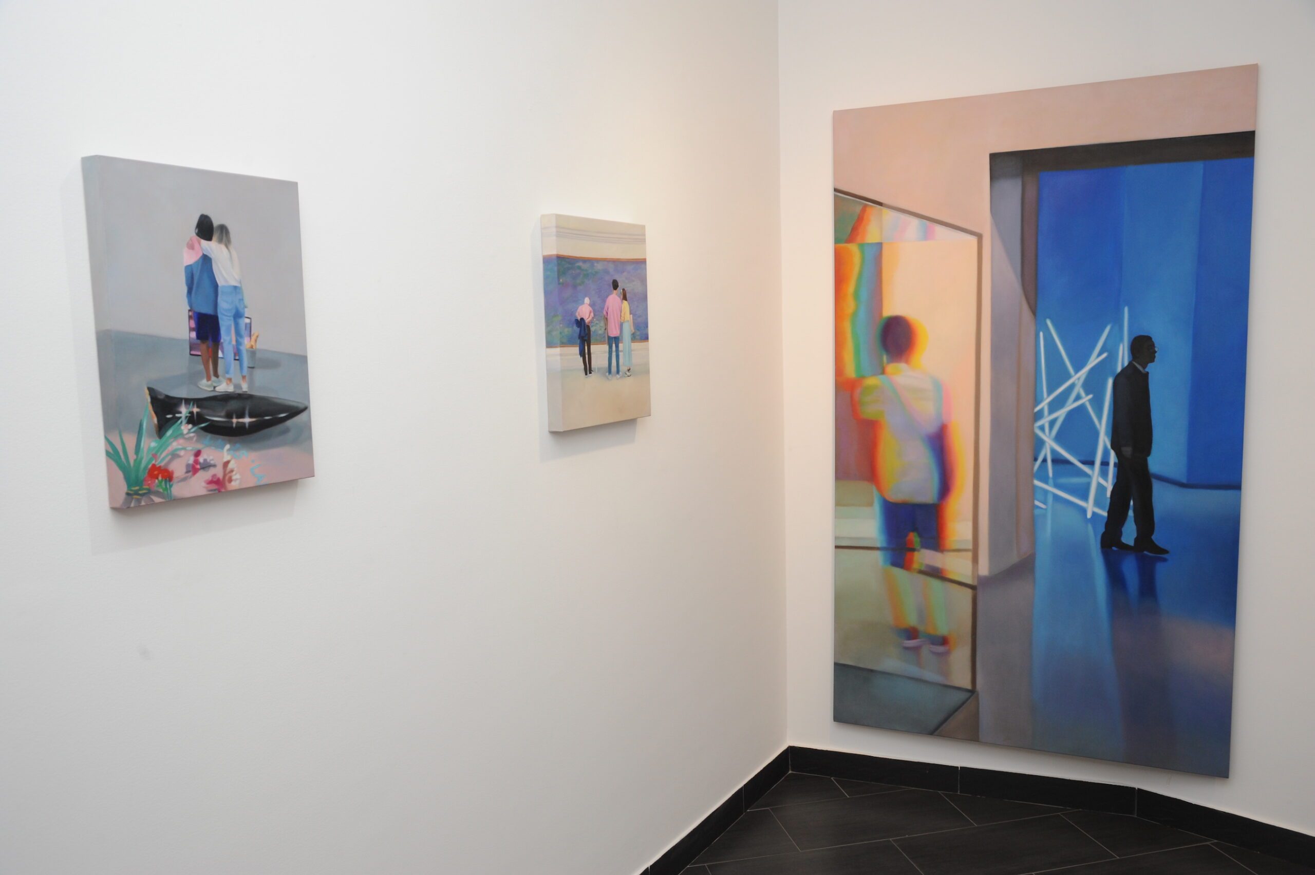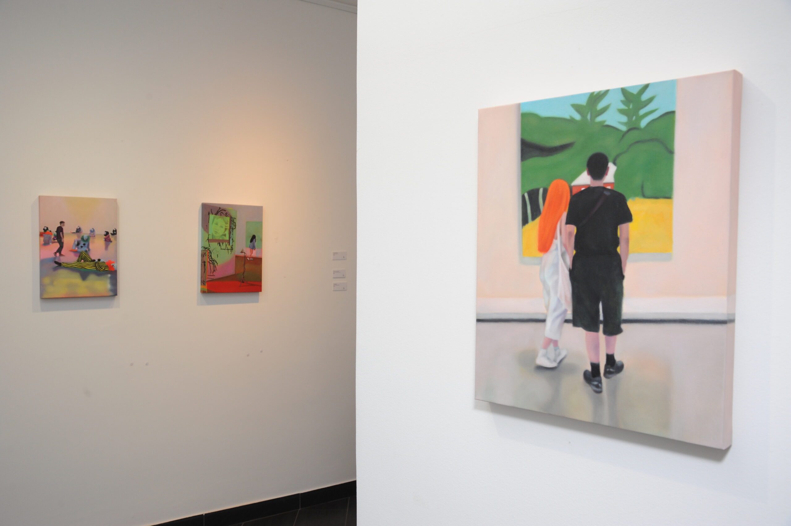 Marija e-mailed me to explain that she conceived the exhibition in 2017 when she photographed in the Museum of Contemporary Art in Paris – Palais de Tokyo – a girl who had asked somebody else to photograph her in front of an artwork. Marija also said she was intrigued by the need of a person to unite with an artwork and thus become a part of that picture/photograph. We can imagine that such a person not only wishes to keep for her/his own sake (on the mobile phone, for example) a photograph of an artwork she/ he cares about, but these persons also want to be re- minded of the moment they were observing that picture by looking at themselves next to that image. This situation might be less moving than the first, but it need not be less interesting. All right, we can say that mostly it is about the commodification of a picture or a situation when that particular person needs such a photograph in order to put it on his/her Instagram and thus enhance his/her social status. Such persons show that art is important for them, that he/she has an outstanding taste for art or, perhaps something else. On the other hand, it could be a person who wants to remember a work of art he/she has seen and cares about. It is interesting that sometimes it is not enough to photograph the location we want to remember but it is much more important to see oneself, one’s own body, facial expression, something we can recognise as “myself at that particular moment”. In this way, the memory of an image and the memory of oneself as a witness to a certain moment, the memory of our physical presence, get overlapped. When a photograph, as a document, becomes an image or a new artwork, it emanates the relations that include us, who are observing the image through the gaze of the person who has composed/photographed the picture, bearing in mind that the person photographed is posing to a completely different lens. That expanded gaze creates a totally different way of observing these pictures.
