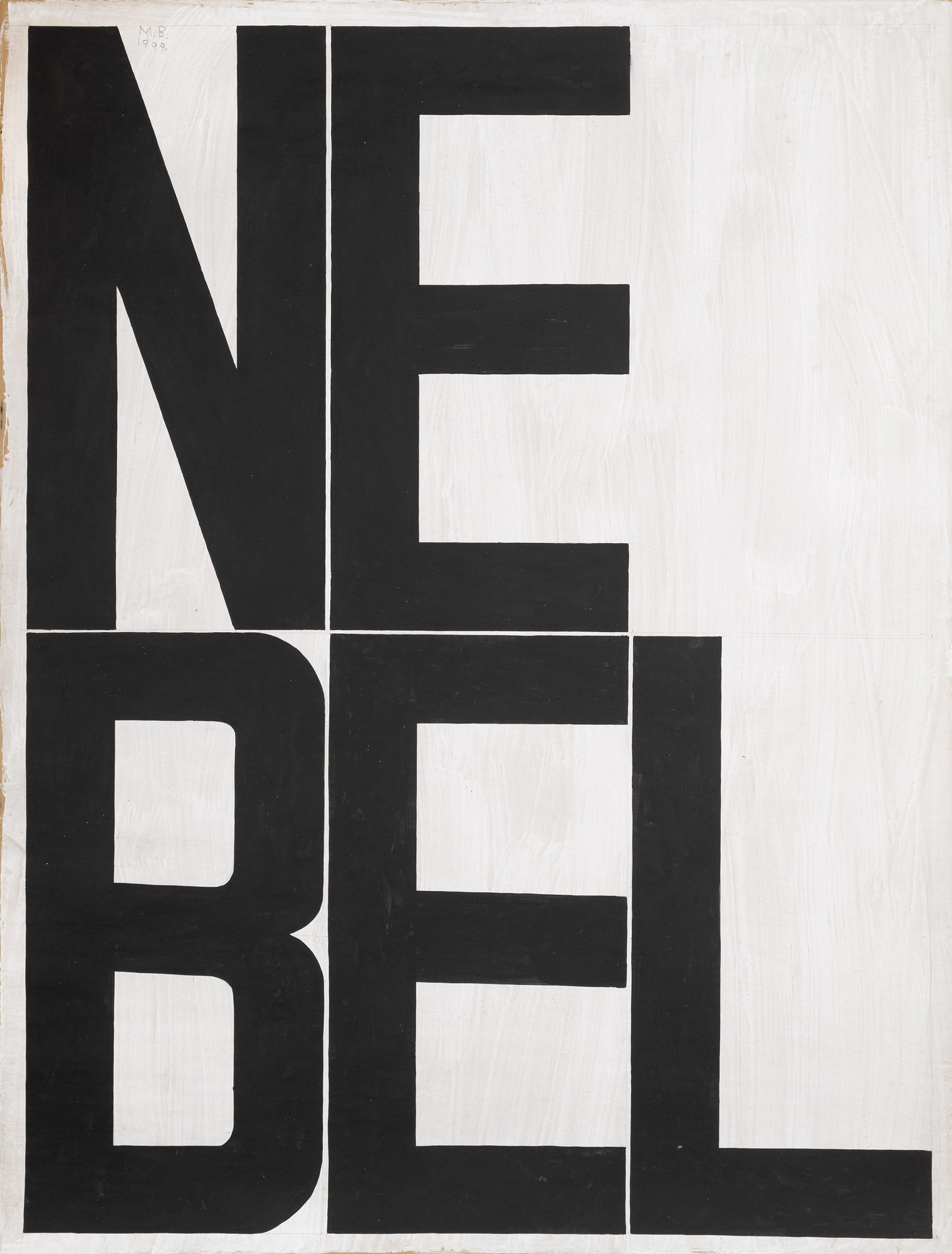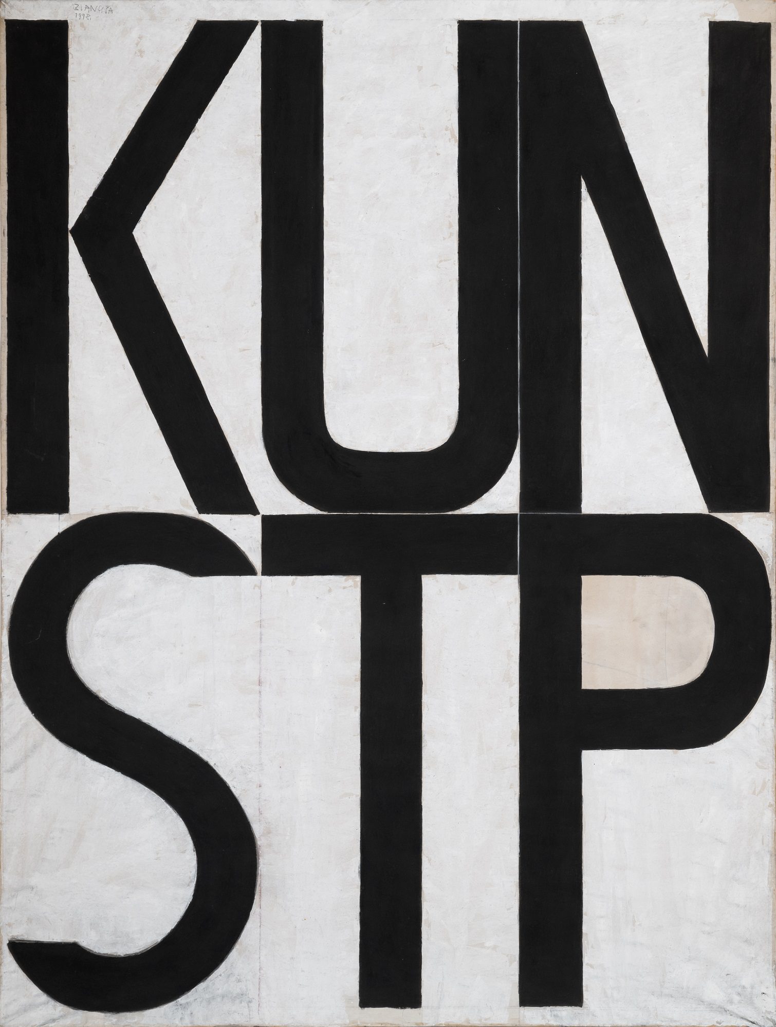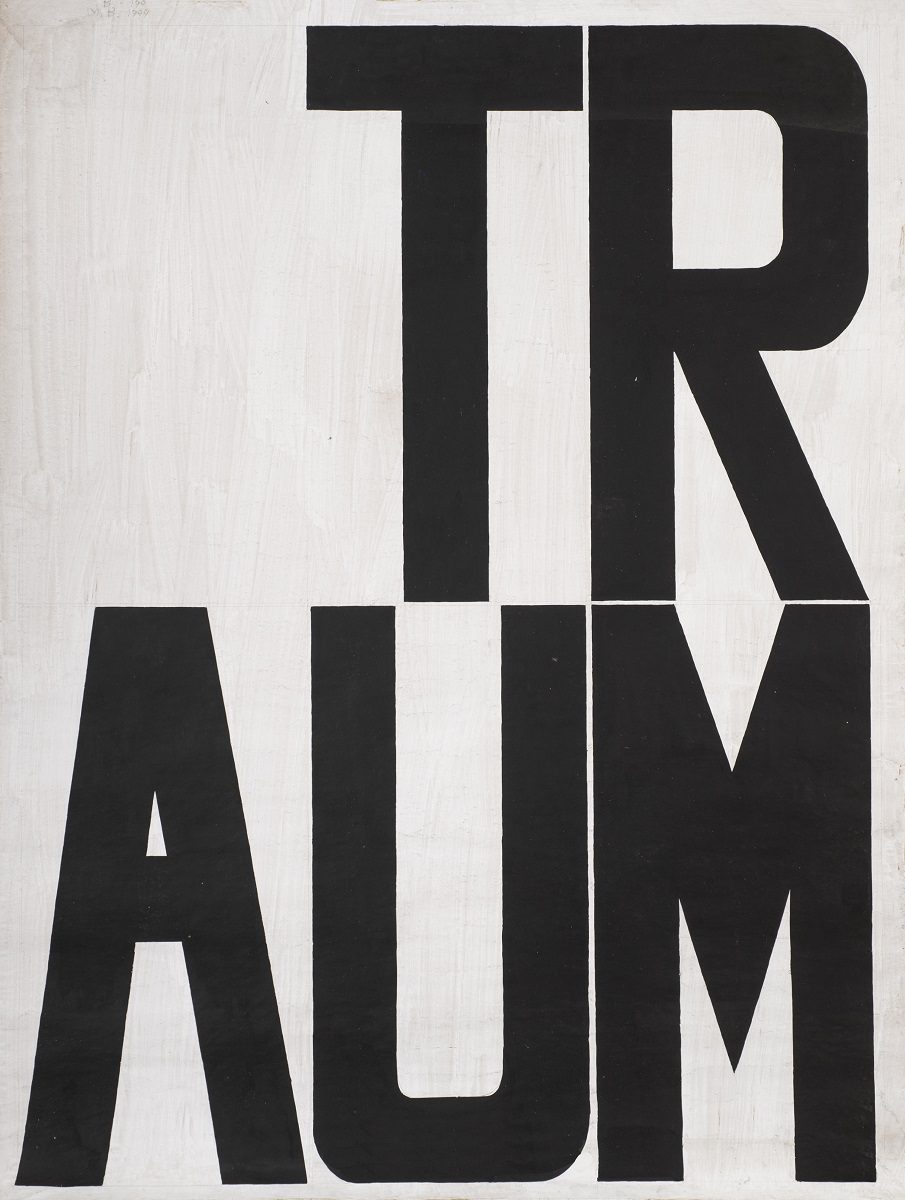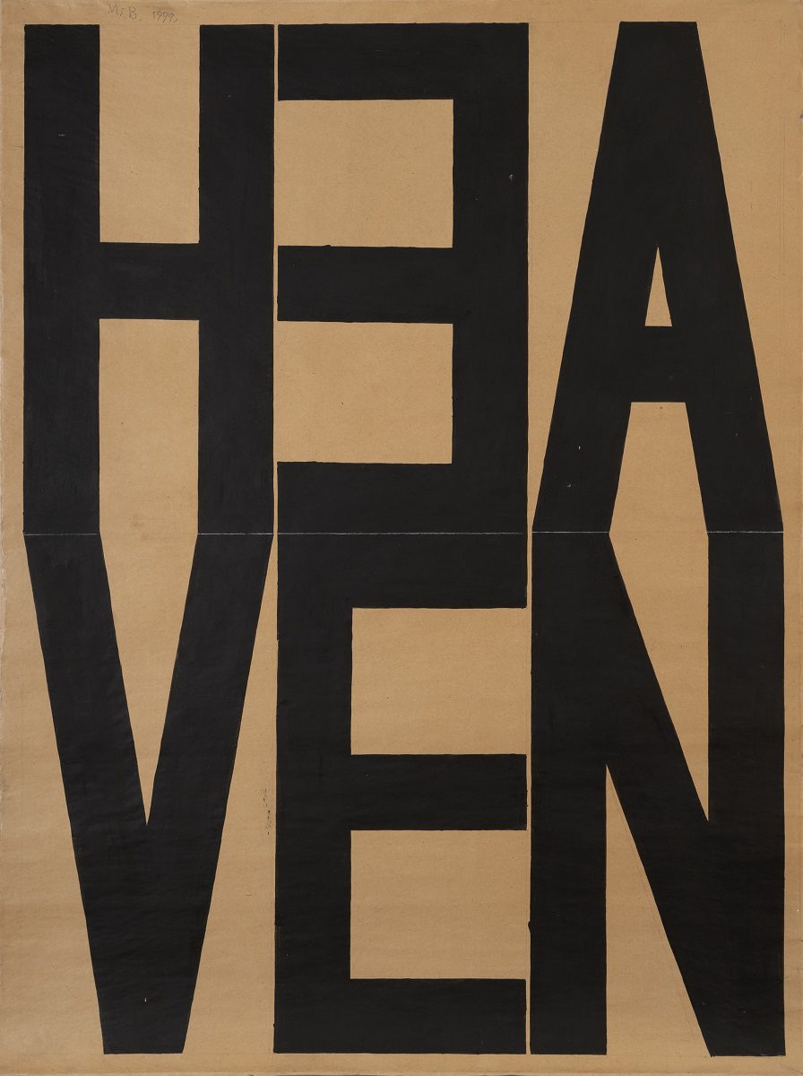 Between March and June 1999 Milan Blanuša produced a series of artworks that would soon become a unique episode in his overall opus. The word appears as the only motif of those drawings. Painted in black on big format paper sheets (200×150 cm) the concrete word strikes the observer first as a monumental and geometrically structured composition. Divided in two rows and oriented towards the visual compositional logic instead of grammatical, there are words in German and English: TRAUM (dream), HIMMEL (heaven), NEBEL (fog), BLITZ (lightning), KRAFT (strength, power, force), NORVAY, INSTALLATION, IDEE (idea), STREIK (strike), KUNST POLIZEI (art police). Until the exhibition in Gallery RIMA, more than two decades after they had been created, the artist had not shown these drawings as an integral series and for that reason this is a retrospective opportunity to re-examine the position these works hold in Blanuša’s opus. The main characteristic of these drawings – a decade long continuity in Blanuša’s painting – is the use of textual inscription in the picture, in German and the English languages. However, what becomes evident at the first sight is the fact that the text has become the only motif of the picture, the only carrier of content and form. Having in mind just that one element as the spot of transformation in Blanuša’s work, this series stands for several important issues: What is the role of text in Blanuša’s pictures, and has it changed in these works? What is the motivation of this creative episode, and has it had any influence on artist’s later creations?