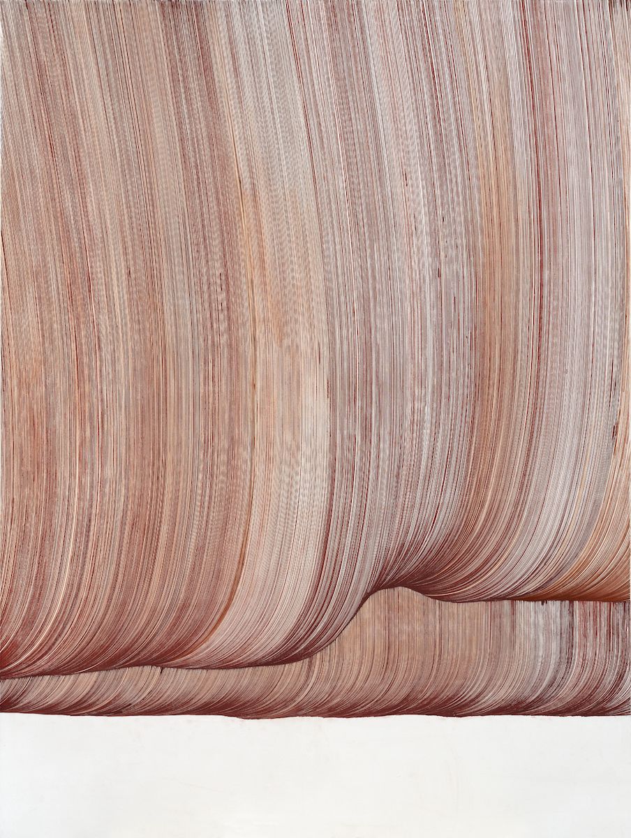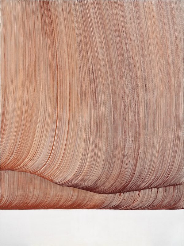 The impression of expansion, growth, overflowing, as enhanced in his models of diptychs, triptychs and polyptychs, is the issue of artist’s focus on the process of shaping – on the creation and transformation of shapes, rather than on the final form. Even when he shows the semi-finished, seemingly three-dimensional forms, they miss the characteristics of real objects. By levitating in the white, non-representational emptiness, forms as the one in his picture Zarathustra, are devoid of corporeality and therefore their third dimension, indicated in internal shading but not anchored in mass or its position in space, appears in fact to be an illusion. Form appears as the visual trace of a wavy vibration of a uniform frequency, locked within the infiniteness of a loop. In his latest triptych – Curtain (2023) – tied to the cycle of Poem (2020) and the diptych Red Rain (2020), where a fluid red shape expands broadly and continues from one picture to another without any final borderlines – suggests an even more immediate impression of a somewhat indefinite, but vital and dynamic process that is flowing, without any visible borders. Whether it is a drapery, a “curtain of rain” or any other inspiration or possible association – the content of the picture is in fact movement and not the object. Although the artist finds seeds of his works in different phenomena from his own surroundings, primarily in nature, or, let us say, in the rain, in the wind, in flora or fauna, he does not notice a concrete object or phenomenon, but the common elements of their existence. Could Curtain suggest air movement or perhaps the conduct of fluid such as the epoxy resin the artist uses in his sculptures? It makes no difference. A totally purified application of the basic elements of a picture – thin lines, one colour and white background – indicates the bare, fundamental meaning of the presented dynamics, without any effort to define it precisely. Clusters of the lines that set the broad coloured surfaces in motion are not presentations of the striped weaving of the curtain or a water mask – those are the internal dynamic curves of the visible world. This is supported by the very title of the work – Curtain – with its purpose to shelter and hide indicates in fact that something exists behind it. In other words, Čpajak is not interested in the curtain, but the hidden entity that endows it with its identity and purpose. For that reason he does not show solid forms completely covered with pigment, but weaves them for a long time and gradually from individual lines, taking care that the internal compound structure should remain the dominant carrier of the content. This confirms again that the scholar and the artist, by means of their talent for perception and intuition can detect the same secrets of nature with an essential difference, while the first endeavours to reveal and explain the second wants to keep their invisibility and interpret the truths of nature through his artistic vision. Being together with the artist a part of the same entity of nature, we can easily recognise this fundamental dynamics, without the effort to rationalise and decode it.