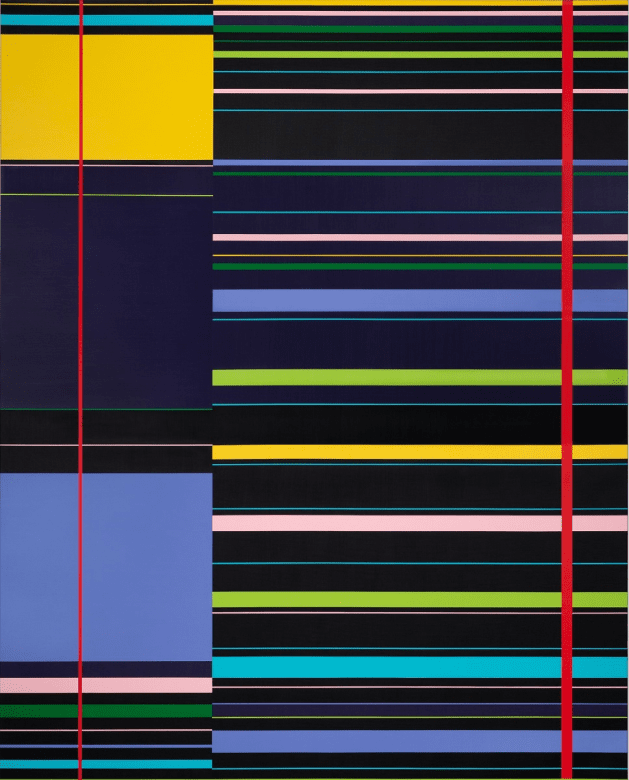 Nikolić’s pictures, for example, those from the latest series Rhythm Variations, morphologically represent surfaces where the artist establishes diverse arrangements of straight lines and regular rectangular fields of different formats and dimensions, by using elementary geometric images and pure colours, free from even the smallest imprecision of the “free hand”. The presence of the artist is erased by a series of procedural stages – from a digital outline produced on a computer, over the transference of that delineation onto the canvas by use of technical devices, to painting by hand when any facture created on the painting is purposefully avoided. The paint is applied flatly and evenly within one field, without tonal variations or any visible traces of brush strokes. Therefore, the picture has been planned in advance, its realisation is also according to plan and in the process of its materialisation there is nothing unexpected or spontaneous. The meaning of such an application of a traditional painterly technique in Nikolić’s works becomes clearer when juxtaposed to Rosenberg-like type of abstraction, where the imprint of paint on the canvas indicates artist’s presence and where painterly tools are primarily the instruments of artist’s expression. In using the same tools, the artist invests the greatest effort and skill in a totally opposite task – to annul every spontaneity and erase every trace of his own specific painterly hand (as evidenced in another big segment of Nikolić’s opus). This extends the discourse on the autonomy of picture because the painter’s instruments and procedures are observed as integral parts of the painting and not as tools of the artist’s creative act.
