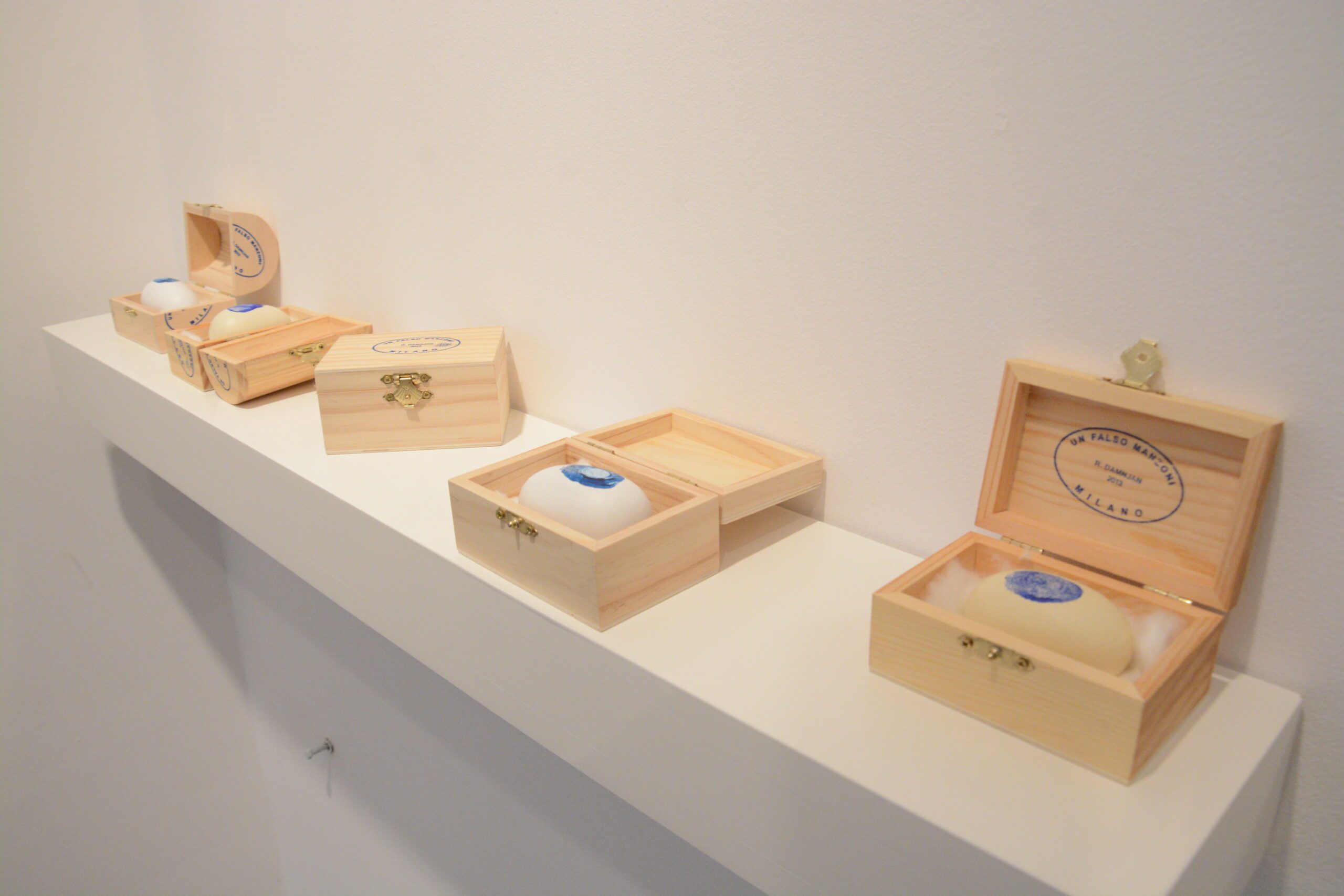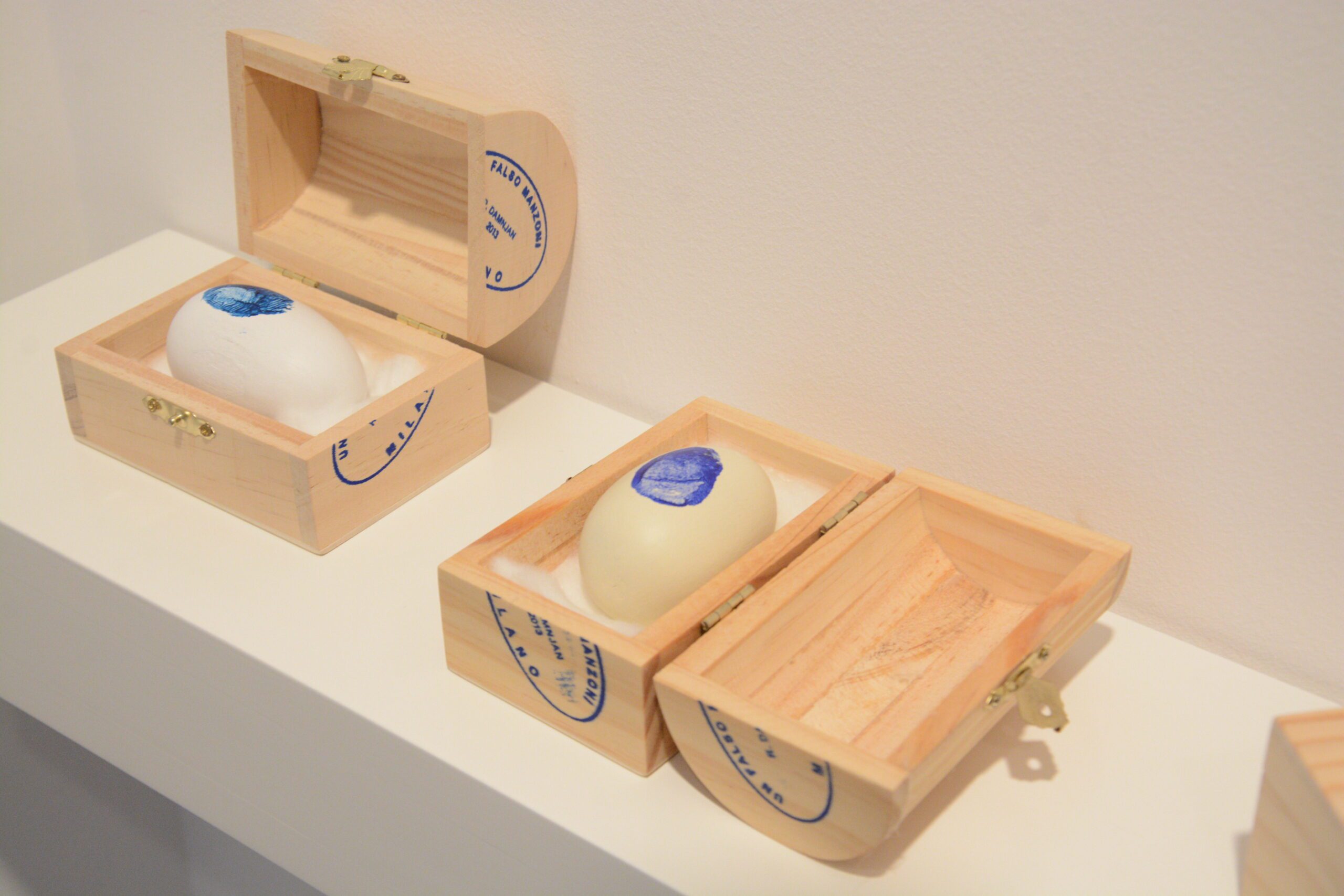 According to the statements by those who know this story, only three boxes with boiled eggs, attested by the imprint of the artist’s thumb, have been preserved to the present day – those marked with the numbers 11, 12 and 34 (all other were, allegedly, eaten at the opening of the exhibition). In order to „multiply“ them subsequently, now as replicas Un falso Manzoni, Damnjan entered upon this intriguing operation intending to bring back to the contemporary art scene Manzoni’s idea from long ago, but this time in a subsequent treatment and as his own work.