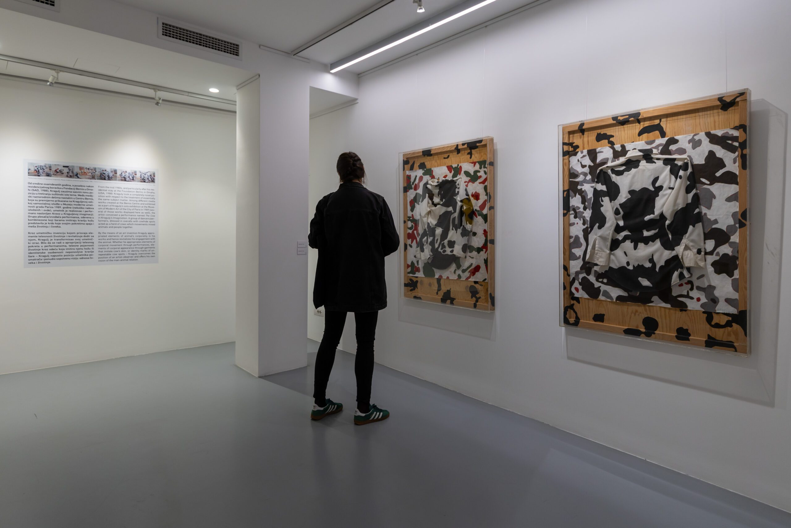 On the occasion of the multimedia exhibition project Kraguly. Hathor: VLK, realised in Belgrade in 1998, in his short explanation of his artistic practice the artist stated: “The continual distancing and separation of man from his nature is the prime subject matter of my works”. In his entire opus Kraguly used to impress us with the realistic meticulousness of the figures of domestic animals and their environment, he hypnotised us with endless fields of cow spots, suggestively mixed our reality with the reality of his works in installations with real cages, fodder and farm objects, enthralled us with the choreography of cow-like dancers, left us absorbed in thought in front of the sign of cow’s horn and the complex symbolism of the goddess Hathor, inviting us on an imaginary walk through his Dairy Museum. Since as observers we are directed to the animal in Kragulj’s works and confronted with the tragedy of its existence in the highly industrialised world, it seems necessary to underline once again that man, who is responsible for the destiny of domestic animals in a developed consumer society, remains the “primary subject” of the artist’s thinking and creative activity – the one the artist addresses with each of his works. The relationship to the animal, as a paradigm of man’s understanding of himself and the world, has always anticipated the relationship to another man, to the one who is understood “as the other” for any reason. Therefore, it is not accidental that Kraguly, like many leading thinkers of his time, compared contemporary farms with concentration camps, and identified mass killing of animals (the destruction of livestock) because of epidemics with genocide. Kraguly’s overall artistic practice was, in fact, the artist’s inspired contribution to the struggle for a new humanism, for a radical change in man, individually and collectively.