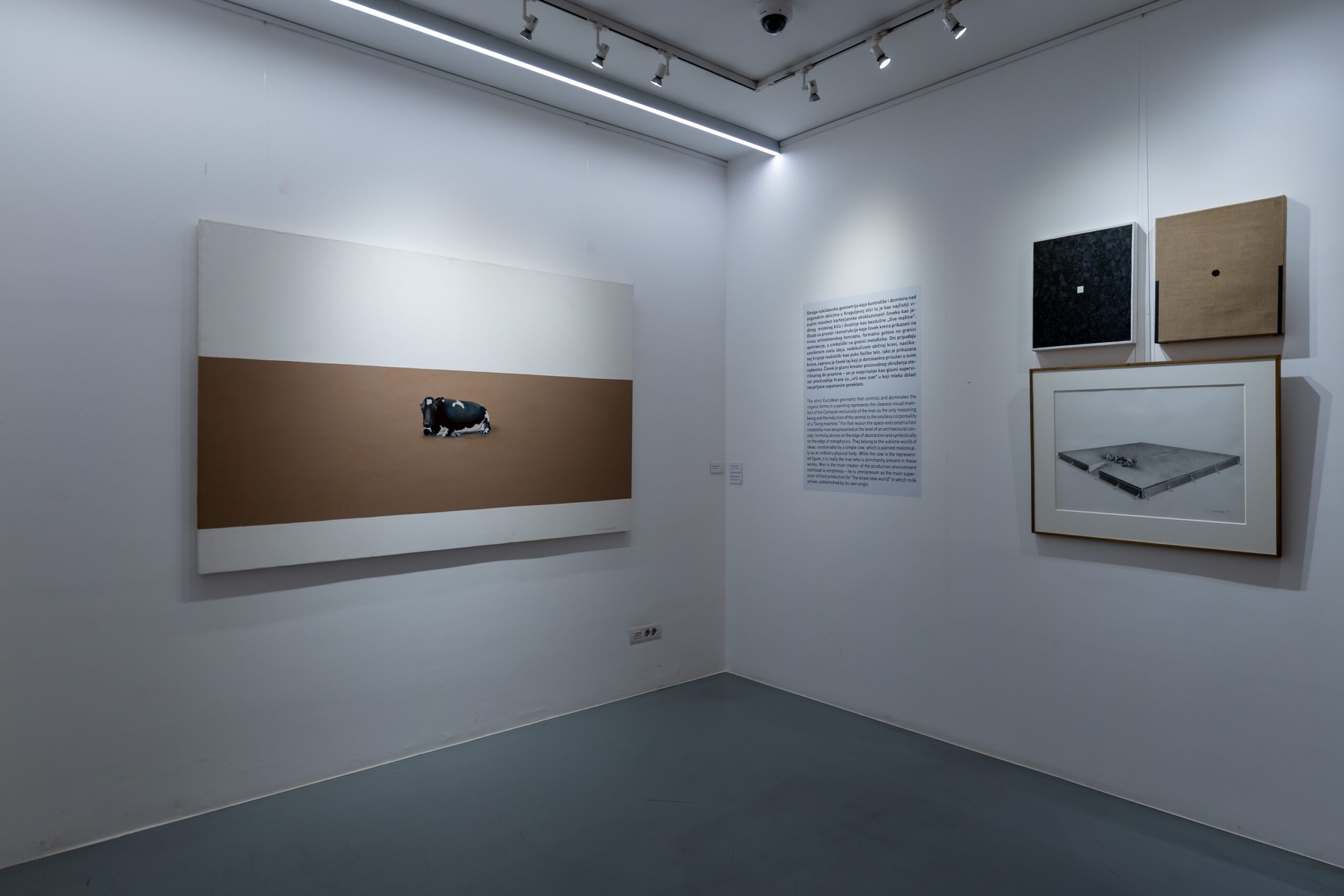 Reason, as the highest signifier of man’s specialness in relation to the rest of the living world, has been presented here with its reverse side – as a generator of the pathological distance from the world man biologically belongs to, from nature and from the animal as its exponent closest to man. The strict Euclidean geometry that controls and dominates the organic forms in a painting represents the cleanest visual manifest of the Cartesian proposition I think, therefore I am. For that reason the space and construction created by man are presented at the level of an architectural concept, formally almost on the edge of abstraction and symbolically on the edge of metaphysics. They belong to the sublime world of ideas, unattainable by a simple cow, which is painted realistically as an ordinary physical body.