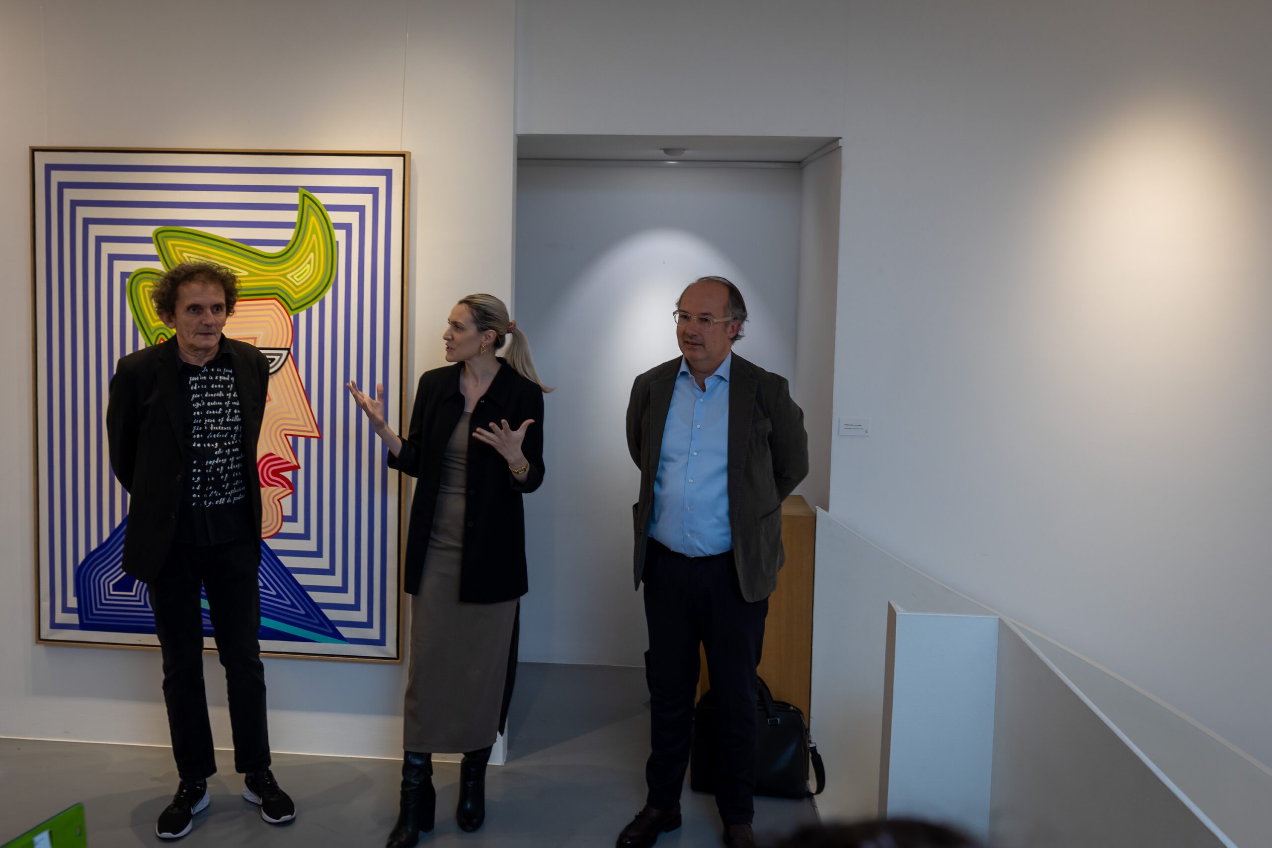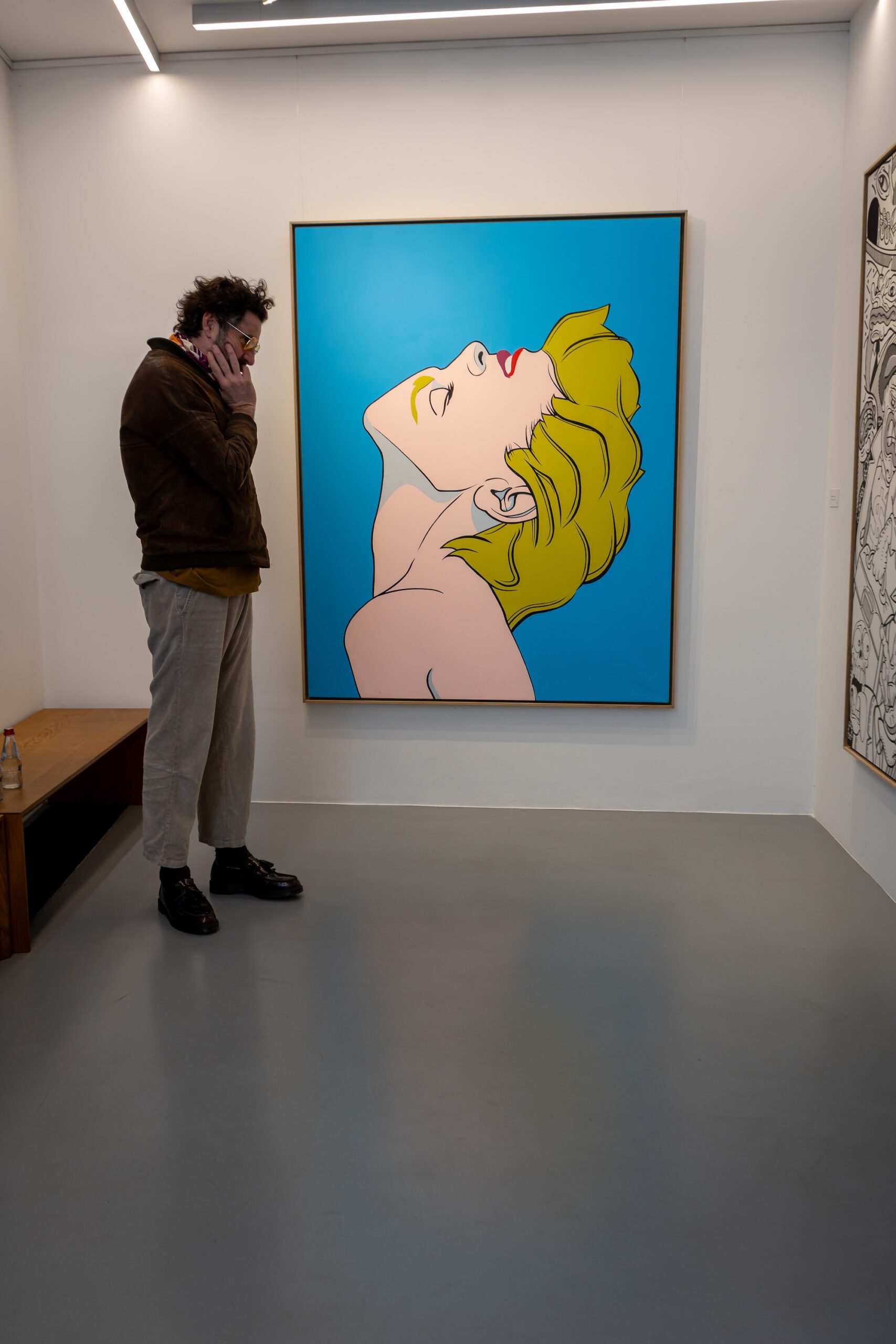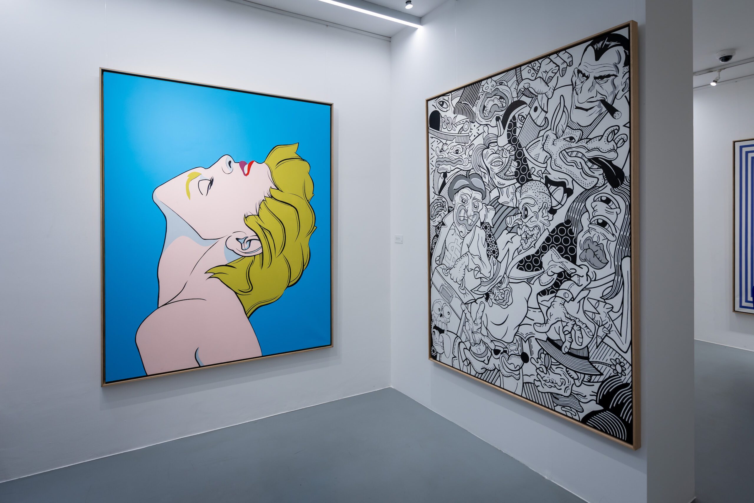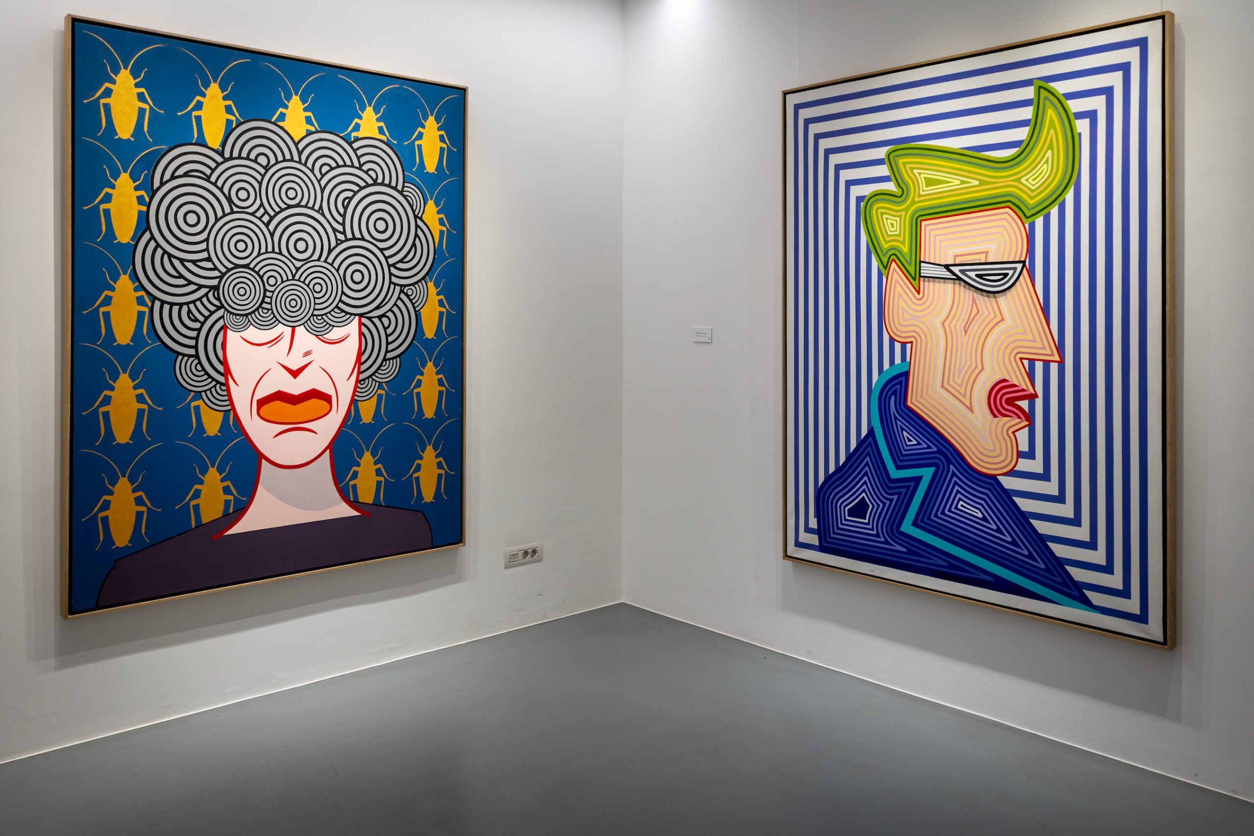 With the exhibition in Gallery RIMA Marković is making two steps forward in relation to his previous three-decades long practice: certain works are purified and devoid of detail, and colours are darker. The artist points out that this change is due to the manner in which we see colours today when our eyes are in permanent contact with smart phones, computers and TV screens; on the other hand, their advertising aggressiveness is no longer new and surprising, but a part of our everyday life. Bright and fluorescent acrylics are no longer equally conspicuous as in the previous, technologically more modest context of creation. The darkening of colours is the result of Marković’s visible need for the rigid early vector illustration and the choice of Hard Edge painting that demands exceptional precision in delineation of lateral lines and their uniform saturation with black colours – obtainable only with a tranquil, technically precise and careful movement of the acrylic felt pen, The artist’s persistent adherence to the American comic strip tradition of the 1960s lies in that endeavour, accompanied by the magnifying practice of miniature stills of his early illustrations . However, Marković is singled from that tradition by the colours non-existent in the printed comics of that tradition. By a uniform layering of acrylic non-mimetic paint on the canvas, the artist endeavours to attain the impression of printed illustrations, or the “mechanical procedure of colour creation”, for the purpose of a perfectly caricatural representation of Hard Edge painting.