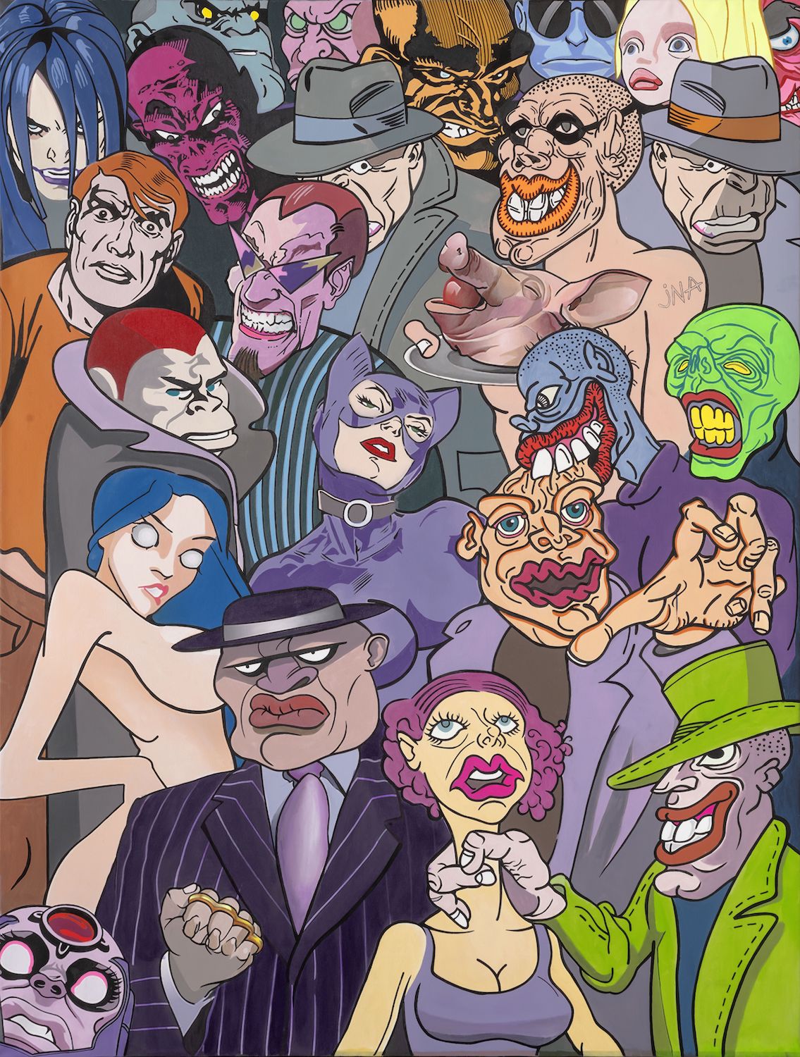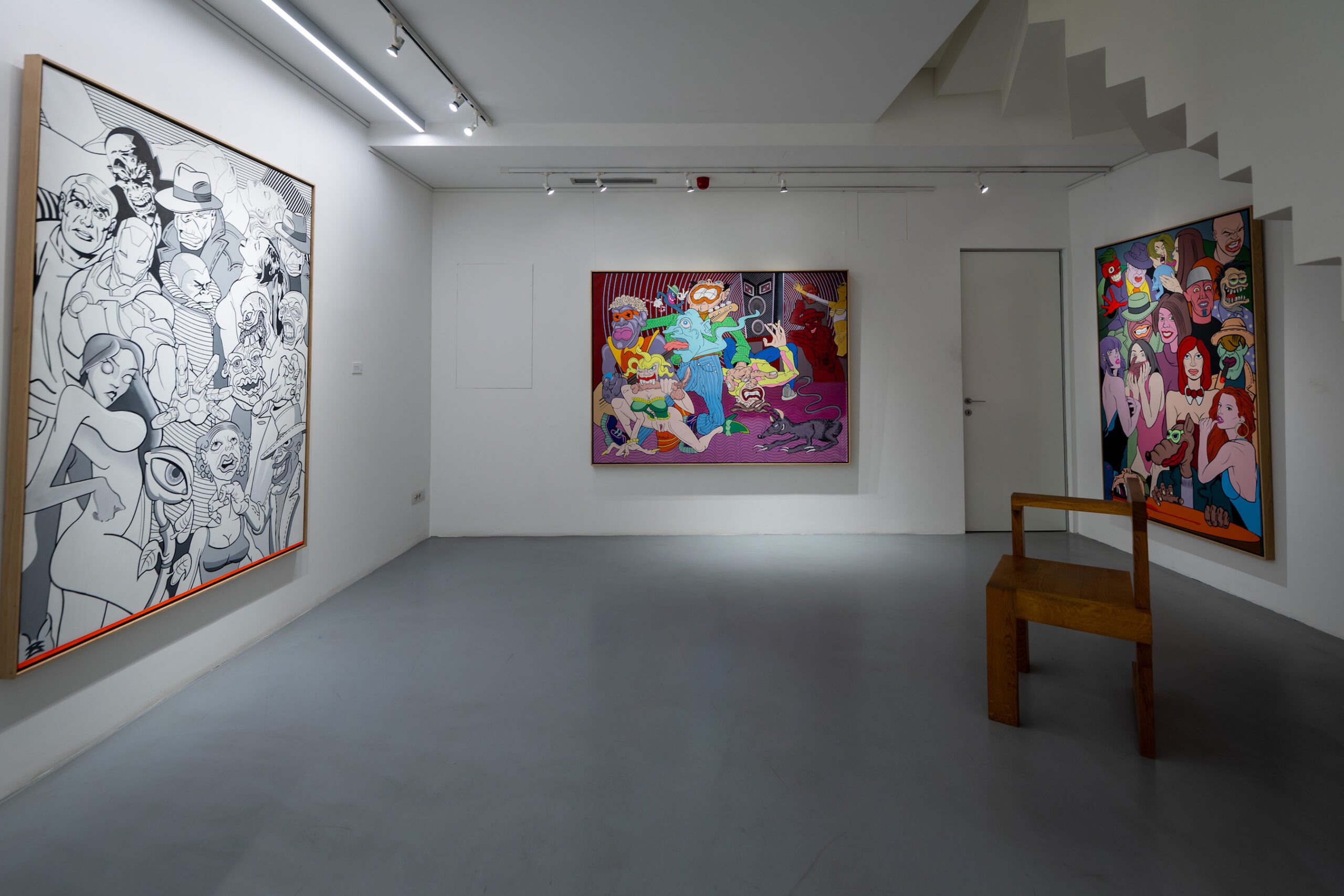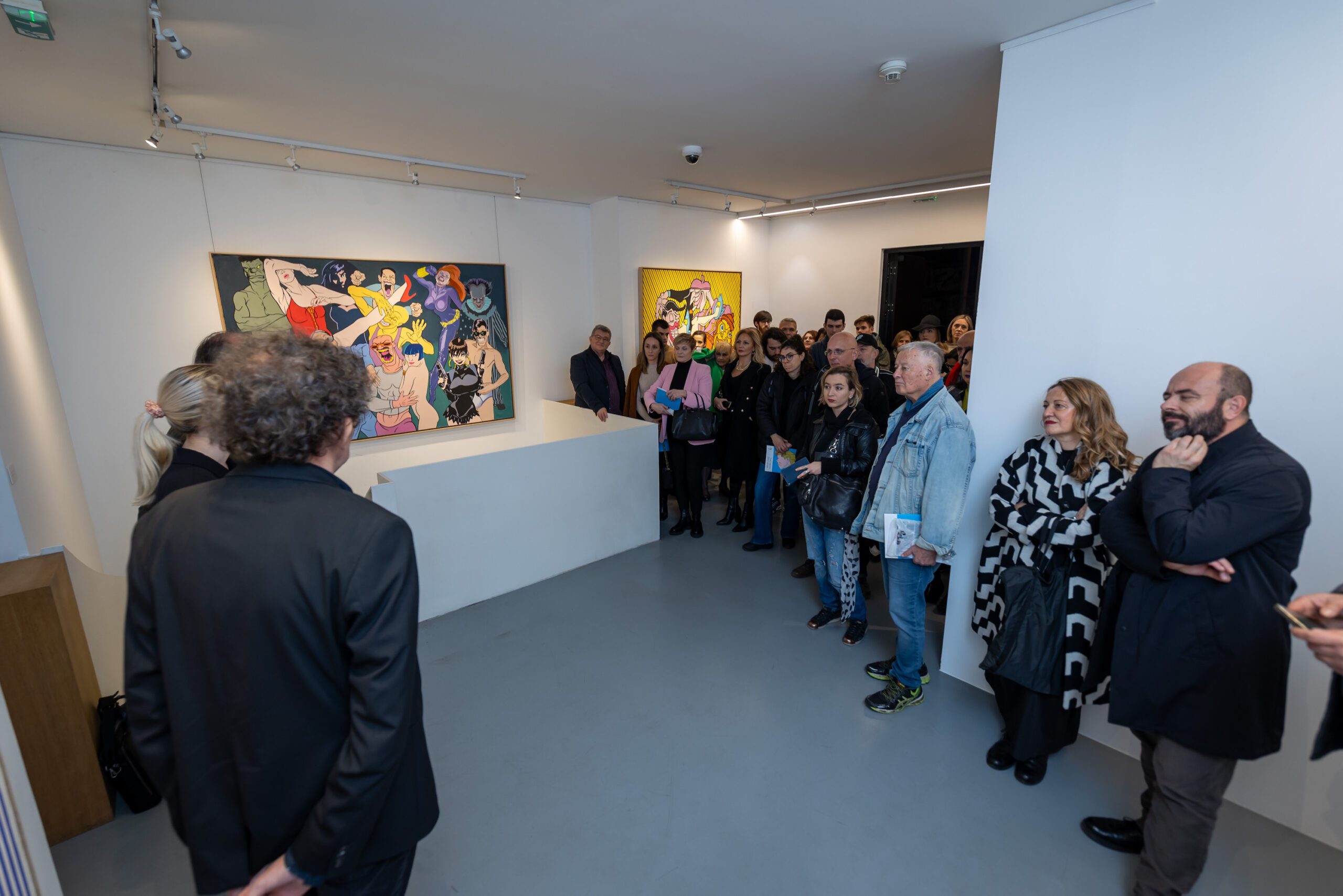 With the many quotations the artist paints thematically uncoordinated and unlikely figures, interweaving comic strip heroes with characters from urban mythology, so that one canvas can simultaneously show figures as reflections of the local social realm and also references to the heroes from Marvel and DC Comic strips (The Weight of The World, Vernissage) without a defined and interrelated symbolic function within the same plane. The artist frequently refers to his own figures of personal mythology, such as the Floral-eyed creature from the flower- pot or the already cult “heroes” of his Crowd. In such a way artist re-examines the concept of originality in art and in his specific parodic manner underlines that such gestures can only be responses to the requirements of the local market requesting a re-interpretation of “famous” figures. Thus they create a galimatias that does not condition the observers’ narrative course, but allows each of them to make individual associations and reactions; all the while one has a feeling that the artist has an ambivalent position. “Man follows his convictions, regardless of their true meanings”, repeats Marković offering the observer a chance to see even those individuals and social strata whose existence we often want to annihilate, but he does not oppose our conscious choice not to see and thus defend our independent truths. For that particular reason his art is not moralising, but an intimate and independent criticism, leaving observers the freedom to recognise social archetypes emerging even uglier with every new crisis, but easily spotted in the “crowds”. For the past four decades, Marković’s big-format canvases contain a transposition of social hypocrisy and overall nihilism – thus “the time of crowds” can be unavoidably understood both as the time of crisis and the time of incessant production of meaninglessness to which one should not get accustomed but should steadily and constantly unmask it “in the small, small, very small country with little time to waste”.