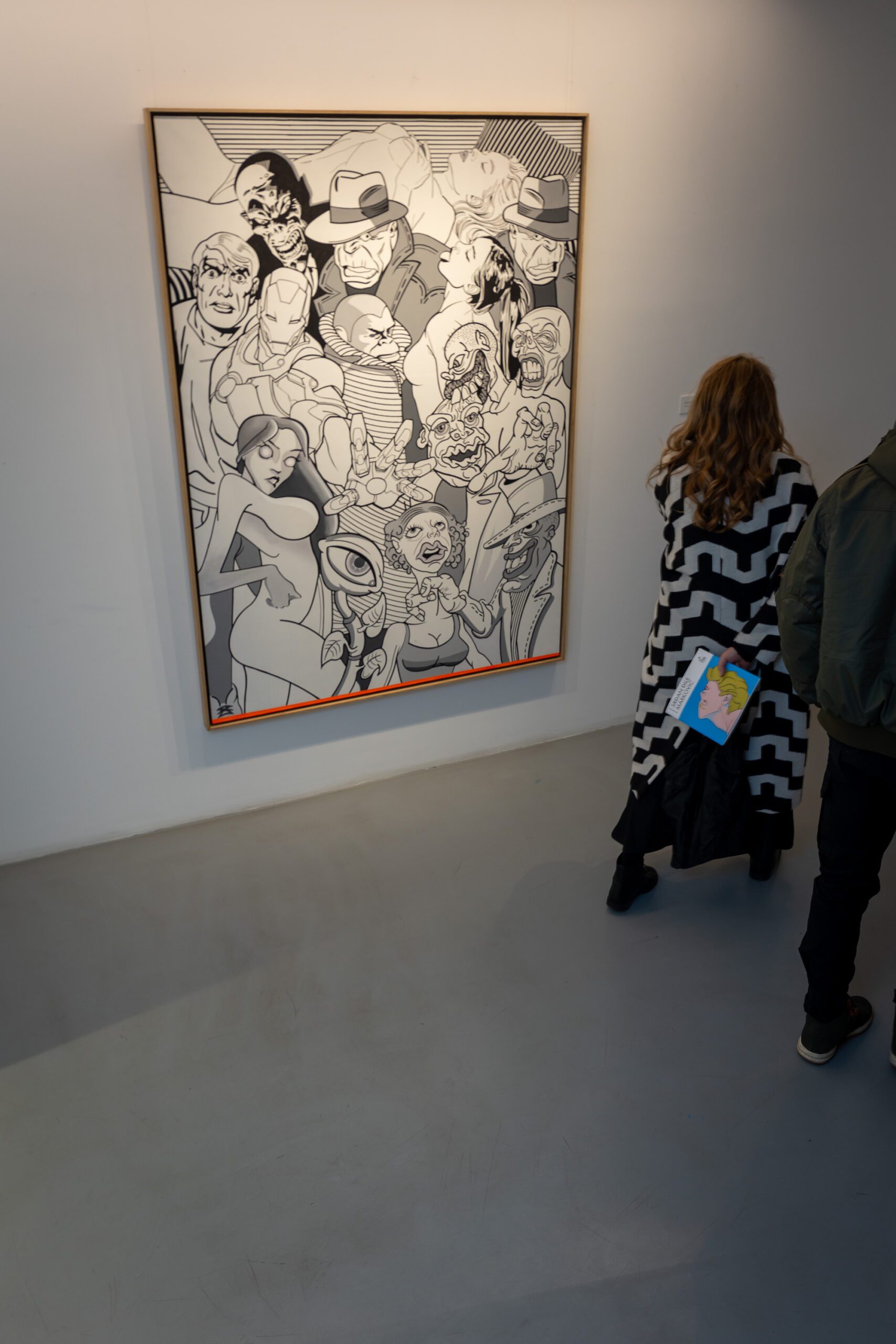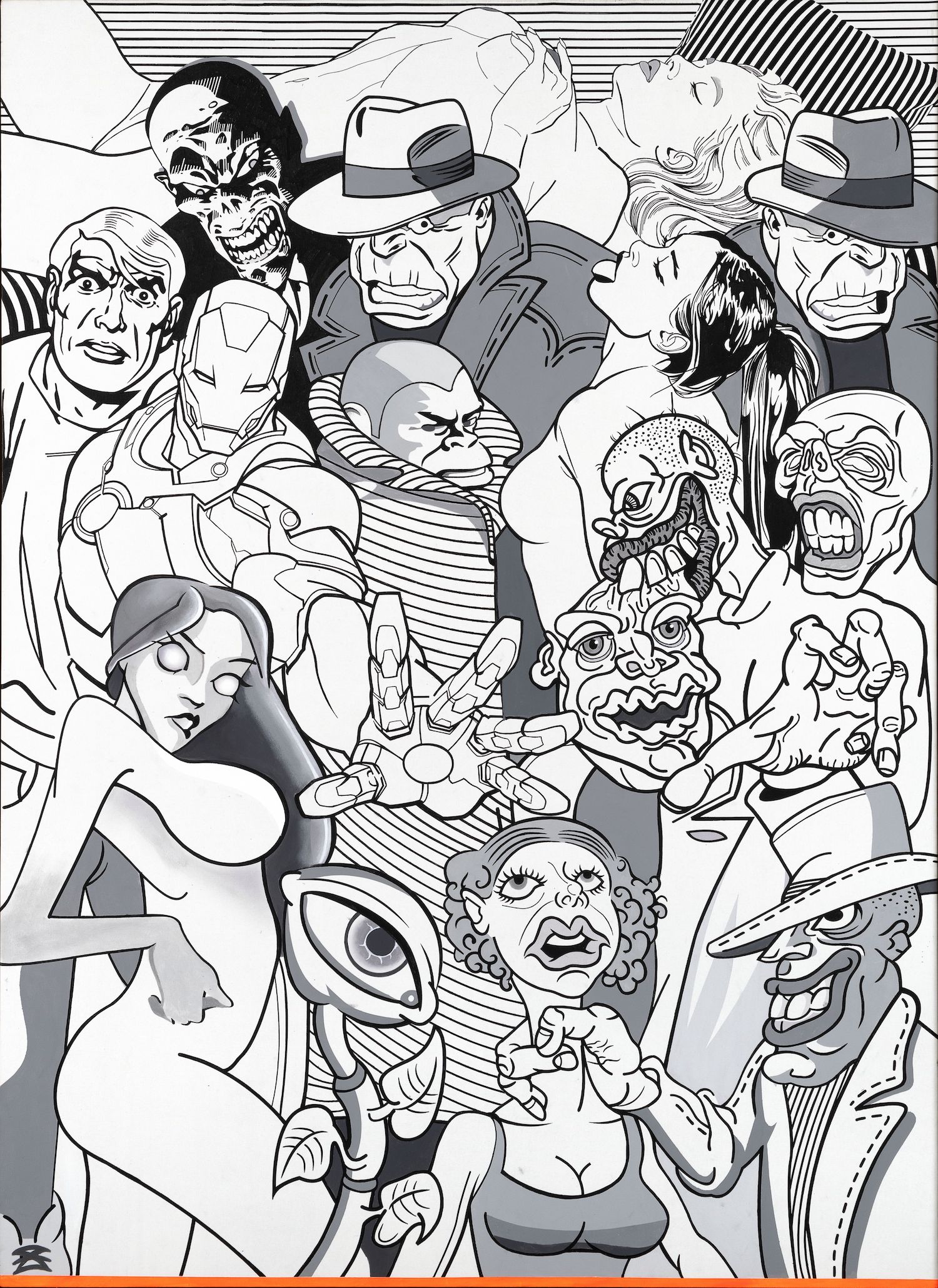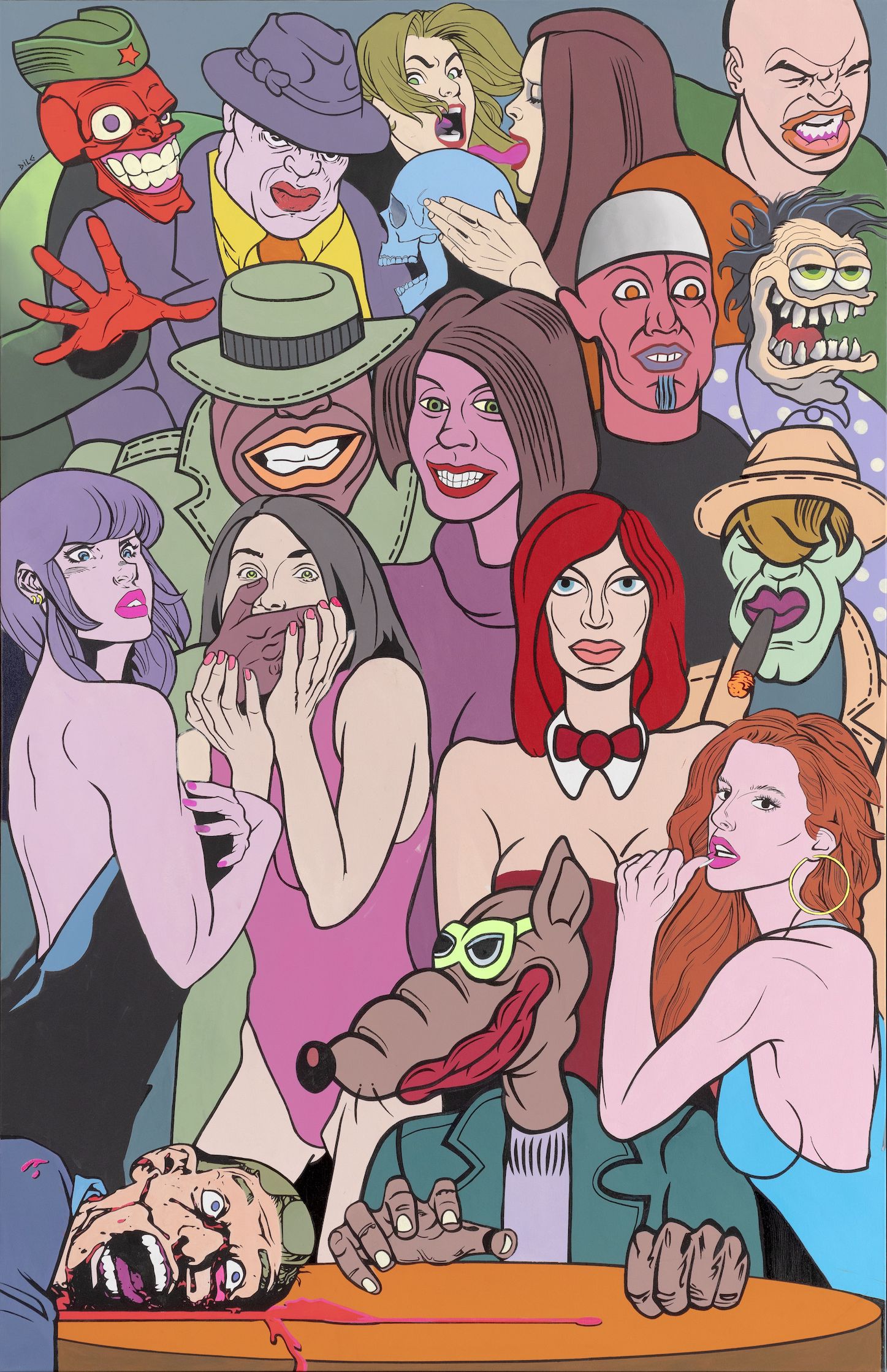With the many quotations the artist paints thematically uncoordinated and unlikely figures, interweaving comic strip heroes with characters from urban mythology, so that one canvas can simultaneously show figures as reflections of the local social realm and also references to the heroes from Marvel and DC Comic strips (The Weight of The World, Vernissage) without a defined and interrelated symbolic function within the same plane. The artist frequently refers to his own figures of personal mythology, such as the Floral-eyed creature from the flower- pot or the already cult “heroes” of his Crowd. In such a way artist re-examines the concept of originality in art and in his specific parodic manner underlines that such gestures can only be responses to the requirements of the local market requesting a re-interpretation of “famous” figures. Thus they create a galimatias that does not condition the observers’ narrative course, but allows each of them to make individual associations and reactions; all the while one has a feeling that the artist has an ambivalent position. “Man follows his convictions, regardless of their true meanings”, repeats Marković offering the observer a chance to see even those individuals and social strata whose existence we often want to annihilate, but he does not oppose our conscious choice not to see and thus defend our independent truths. For that particular reason his art is not moralising, but an intimate and independent criticism, leaving observers the freedom to recognise social archetypes emerging even uglier with every new crisis, but easily spotted in the “crowds”. For the past four decades, Marković’s big-format canvases contain a transposition of social hypocrisy and overall nihilism – thus “the time of crowds” can be unavoidably understood both as the time of crisis and the time of incessant production of meaninglessness to which one should not get accustomed but should steadily and constantly unmask it “in the small, small, very small country with little time to waste”.