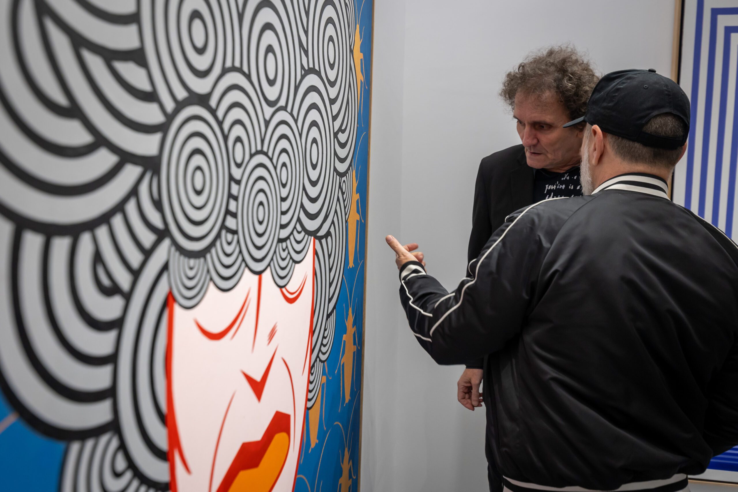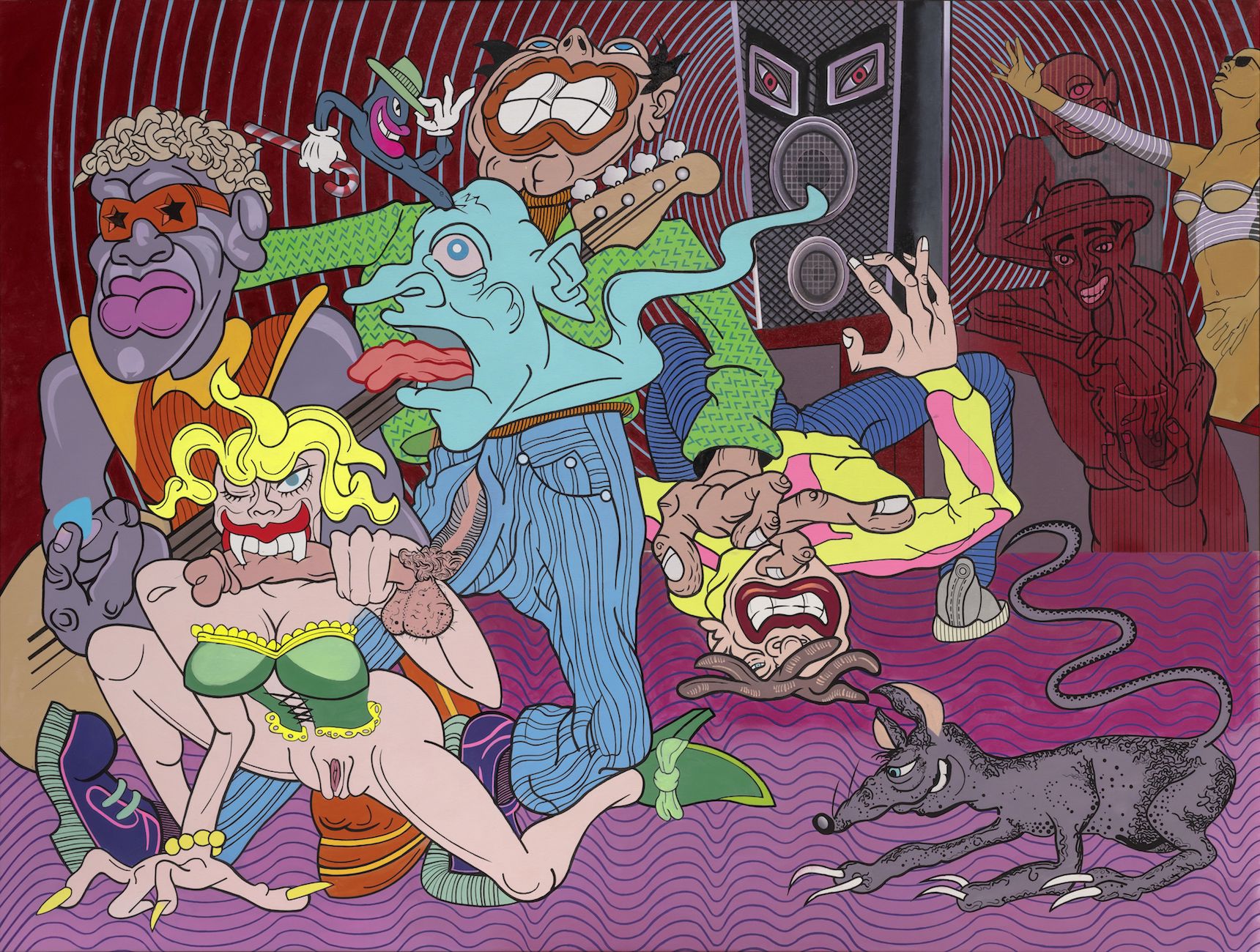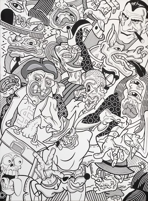 There are many origins and strongholds of Marković’s figurative painting: from the German social are of the 1930s, the tradition of New objectivity (Neue Sachlichkeit), over American underground comix and particularly Californian underground (lowbrow) figuration of the 1980s and 1990s, to the painting of American artists, predecessors of Pop art, such as Philip Guston and Peter Saul. Common to these artistic phenomena, and thereby crucial in Marković’s painting, are their social thematic, commitment and reaction to the existing social and political circumstances, figurative painting and ironic or satirical representation of the reverse side of social reality. The artist is inclined to diverse eclectic and mimetic strategies, primarily symbolic in his works, just like the Op art “aureole” in the painting Investor, frequently playfully ambivalent, but not connected to the figures represented on the canvas. The strategy of Optical art is more frequently present in Marković’s recent paintings and is one of the examples of his flirting with styles in the already perceived playful and frequently mimetic manner which re-examines man’s perception and subsequent cognizance of the perceived. One can recognise in this the distorting intention of the artist, in fact the parody he applies in dealing with the rules of style unity and places himself at a distance from the habitual ways of artistic strategies.