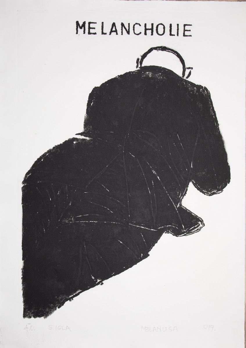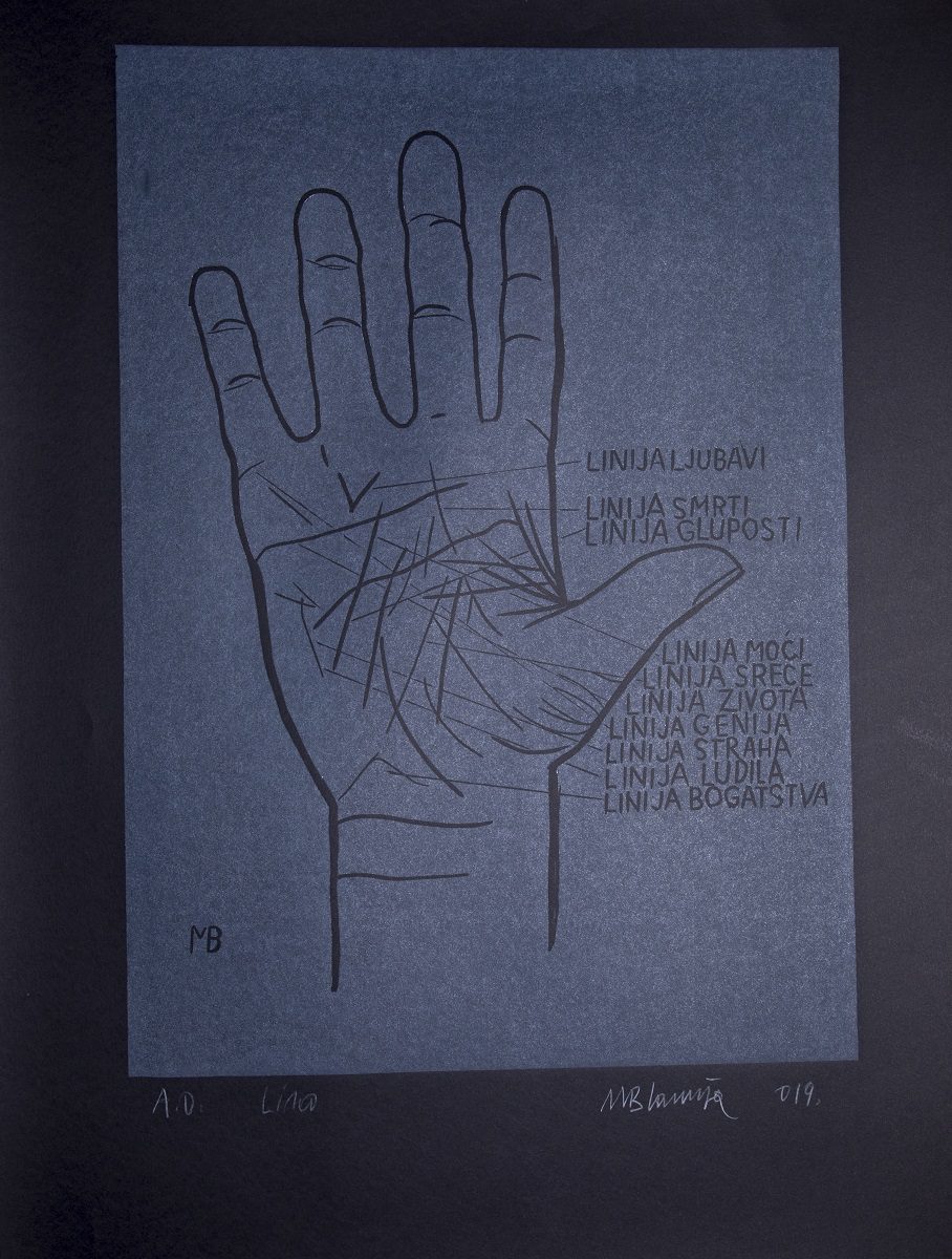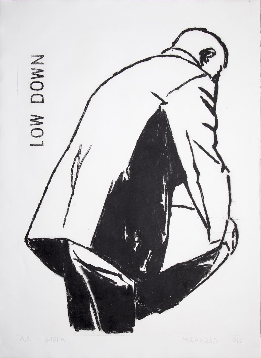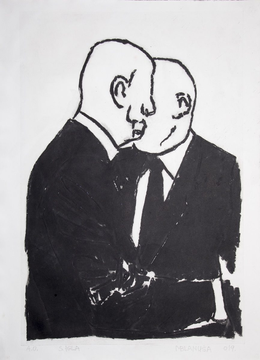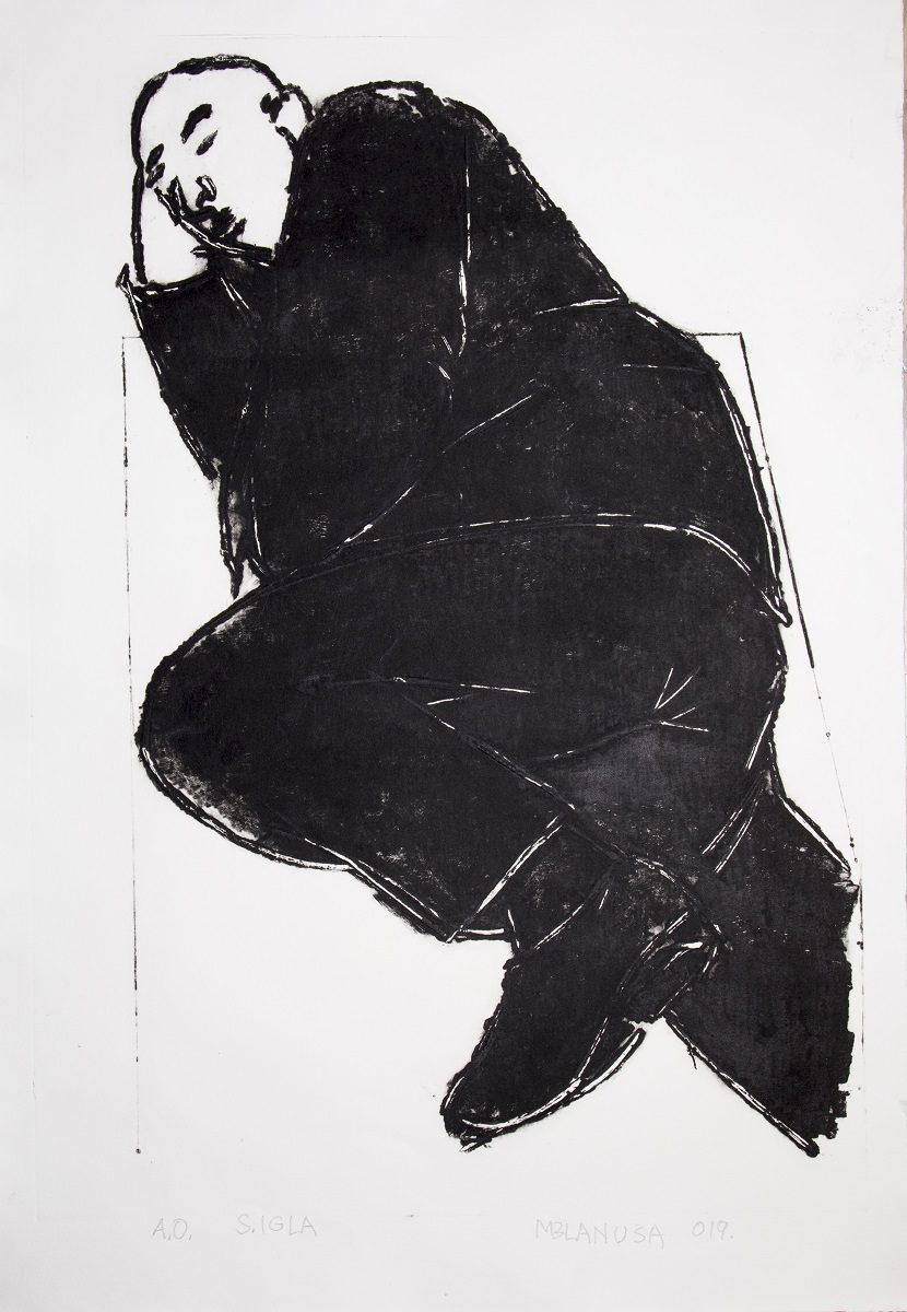 Krajem osamdesetih godina XX veka Milan Blanuša zakoračuje u svoj punu stvaralačku zrelost i tokom narednih decenija gradi idejno i rukopisno jedinstven opus koji paralelno ostvaruje u različitim medijima – od crteža i slike, preko grafike do skulpture. U formalnom smislu nosilac njegovog likovnog rukopisa postaje puna i teška crtačka linija koja kao likovni element za Blanušu ima neprikosnoveno prvenstvo. Liniji on poverava jednako strukturalnu ulogu koliko i ulogu ekspresivnog gesta. Odbacujući cizeliranu opširnost realizma (1) pomoću duboko utisnute crne linije bavi se samo sirovom suštinom predstave. U središtu Blanušinog rada uvek se nalazi čovek, a od kraja devete decenije okosnicu njegove figuralgike čini muška figura specifične morfologije. Odeven u tamno poslovno odelo, sa belom košuljom i crnom kravatom, ovaj muškarac ćelave lobanje najčešće ima opšte i neraspoznatljive crte lica koje su jednako često skrivene tamnim naočarima. Kreirajući i razrađujući specifičan čovekoliki tip Blanuša promišlja o čoveku i njegovoj sveukupnoj degradaciji u uslovima savremenog društva.