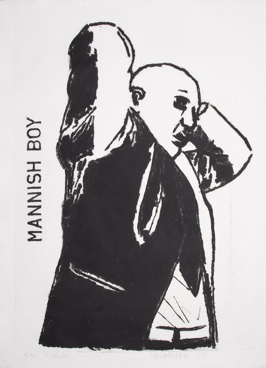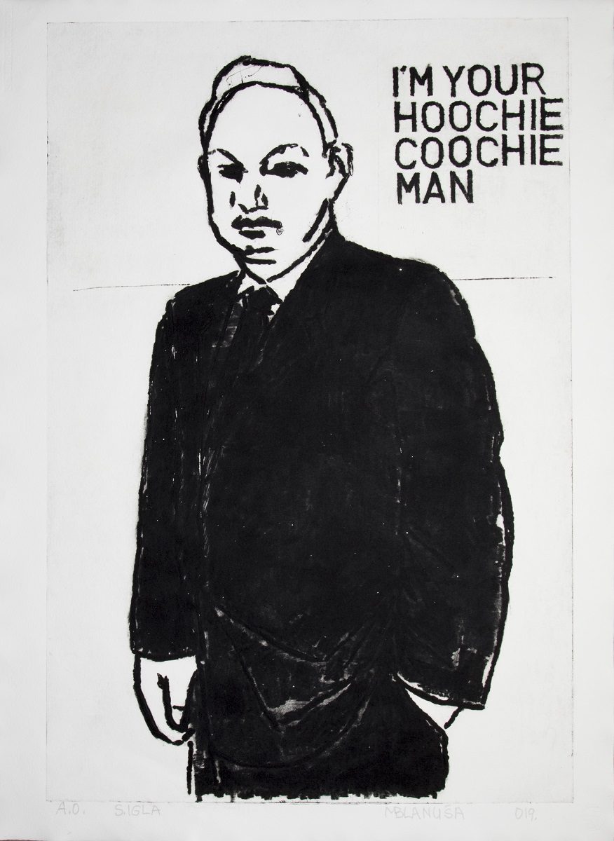 U razradi osnovne ideje Blanušinog rada, važna uloga pripada tekstu. Iako umetnik poštuje autentičnu prirodu jezika te se u njegovim radovima tekst iščitava kao tekst, a ne kao primarno vizuelna forma sa tekstualnom građom (2), ipak smisao reči počiva na neraskidivoj vezi sa naslikanim motivom. Tekst i slika u Blanušinim radovima uspostavljaju ravnopravan odnos na idejnom nivou, nasuprot odnosu dominacije koji bi kao posledicu imao ilustrativnost slike ili opisnost teksta. Karakter tog odnosa je promenjiv i kreće se od komplementarnosti preko napete kontrarnosti do potpunog apsurda, ali je uvek u funkciji dekodiranja centralne ideje rada. „Naslov i predstava su u disparaciji. Veoma mi je važno da slika nikako ne ilustruje tekst, već da tekst naglašava kvalitet suprotan onom koji nosi naslikani motiv“ (3), naglasio je Blanuša govoreći od dvema novijim grafikama koje su se našle u selekciji radova za njegovu izložbu u Galeriji RIMA. U grafikama naslovljenim I’m Your Hoochie Coochie Man i Mannish Boy vizuelni i verbalni jezik se nalaze u značenjskoj opoziciji. Prepoznajemo Blanušine ljude u odelima. Prvi sa rukom u džepu tupo gleda u našem pravcu. Drugi deluje kao da se lenjo proteže, zabacivši ruke iza glave. Tekstovi koji su ispisani pored njihovih figura odnose se na dva istoimena bluz standarda iz pedesetih godina prošlog veka. Obe legendarne numere Madija Votersa, koje su očigledno u sferi Blanušinog muzičkog ukusa, govore o specifičnom tipu muškarca koji se u popularnim stihovima naziva teško prevodivom izrazom – hoochie-coochie man (4). Naime, Voters peva o čoveku rođenom pod srećnom zvezdom koji zahvaljujući naklonosti vudu magije (5) postaje socijalno i emotivno neukrotivi pojedinac (6) i koji svoj život vodi potpuno slobodno, isključivo prema sopstvenim pravilima. Neodoljiv u svojoj nesputanosti, on se nameće svojom seksualnom potentnošću kao alfa muškarac i veliki ljubavnik (7). Neobjašnjivo šarmantan i magnetski privlačan, strastven u življenju i samouveren u nastupu, istovremeno nebrušen i neotesan – hoochie-coochie muškarac jeste radikalna hiperbola individualnosti. „On je sve što ovaj sa slike nije“ (8), kratko je, uz osmeh, prokomentarisao Blanuša gledajući lik na papiru.