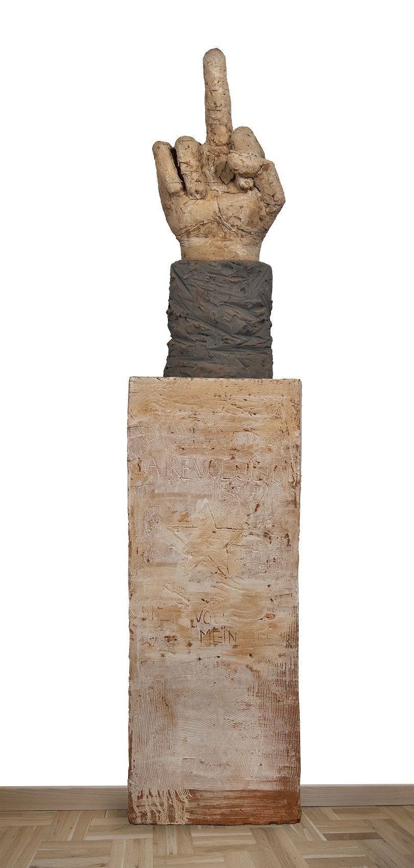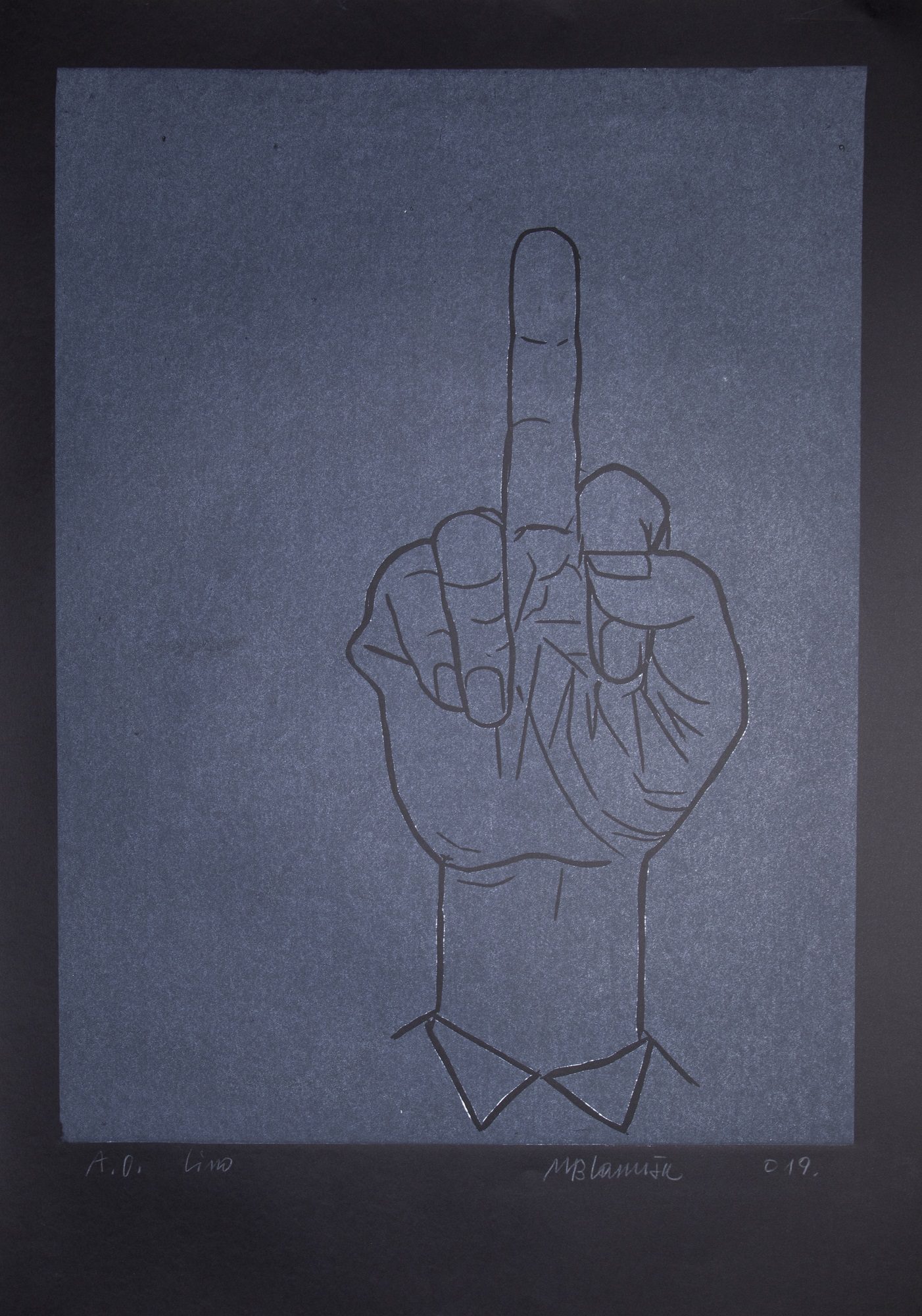 Mada se među ovim neverbalim porukama nalaze one koje komuniciraju društveno prihvatljiva i pozitivna osećanja, čovek u odelu se povremeno opredeljuje za radikalniji izbor. Najbolji primeri moći, upotrebe i zloupotrebe jezika (u ovom slučaju gestualnog) jesu Blanušine skulpture Srpski idol i Simbol u čijem epicentru se nalazi neverbalna uvreda poznatija kao „srednji prst“. Šaka sa ispruženim srednjim prstom, koja u Simbolu stoji višestruko uveličana i dominira nalik trofeju, kroz istoriju zapadne civilizacije je od seksualno konotirane psovke prerasla u jedan od globalno najpoznatijih simbola bunta. Jednako koliko se smatra uvredom, ovaj neverbalni sleng skreće pažnju na pojedinca koji je u stanju da prekorači granicu između društveno prihvatljivog i individualno nužnog. Obznana srednjeg prsta jeste trenutak samoproklamovanja, postavljanja sebe ispred drugih, napuštanja dobrog vaspitanja i društvene obzirnosti zarad davanja slobode potisnutom otporu. „The Finger“(9) je ultimativni gest hoochie-coochie man-a koji zarad imperativa ličnih osećanja (gneva i otpora) pristaje da kao neotesani prostak bude odbačen i prezren od strane drugih. Stoga Milan Blanuša vaja ovaj drski falusni simbol kao što se vaja portretska bista. Ogromna šaka koja se konstrukcijski nalazi na poziciji portretisane glave, modelovana je zajedno sa sopstvenim postoljem. „The Finger“ na pijedastalu deluje kao skulptorska metafora sirovog otpora u svakom od nas, otpora koga smo zarad društvenih konvencija nebrojeno puta potisnuli.