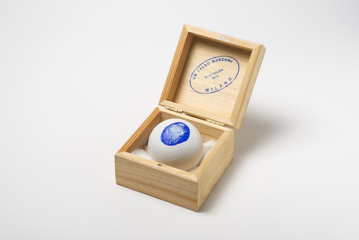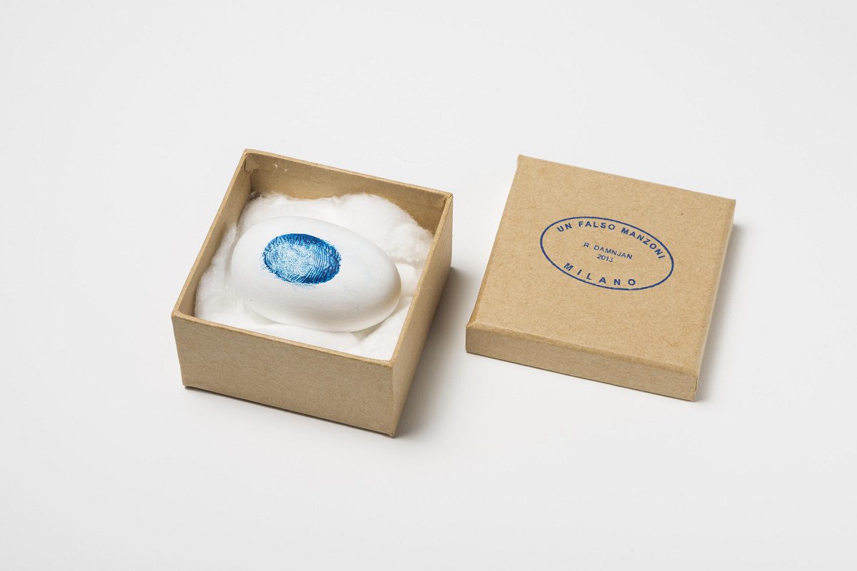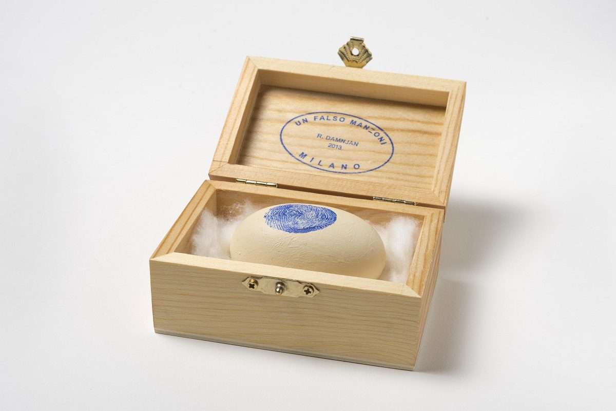 Do danas ostale su – po tvrdnjama upućenih u ovu priču – sačuvane svega tri kutijice sa kuvanim jajima overenim otiskom umetnikovog palca, one pod brojevima 11, 21. i 34 (sva ostala jaja su, navodno, zaista pojedena na otvaranju pomenute izložbe). Da bi ih naknadno „umnožio“, sada kao replike pod nazivom Un falso Manconi, Damnjan se upustio u ovu vrlo intrigantnu operaciju kojom je zamislio da jednu davnu Manconijevu ideju, u naknadnoj obradi i kao sopstveno delo, ponovo učini prisutnom na savremenoj umetničkoj sceni.