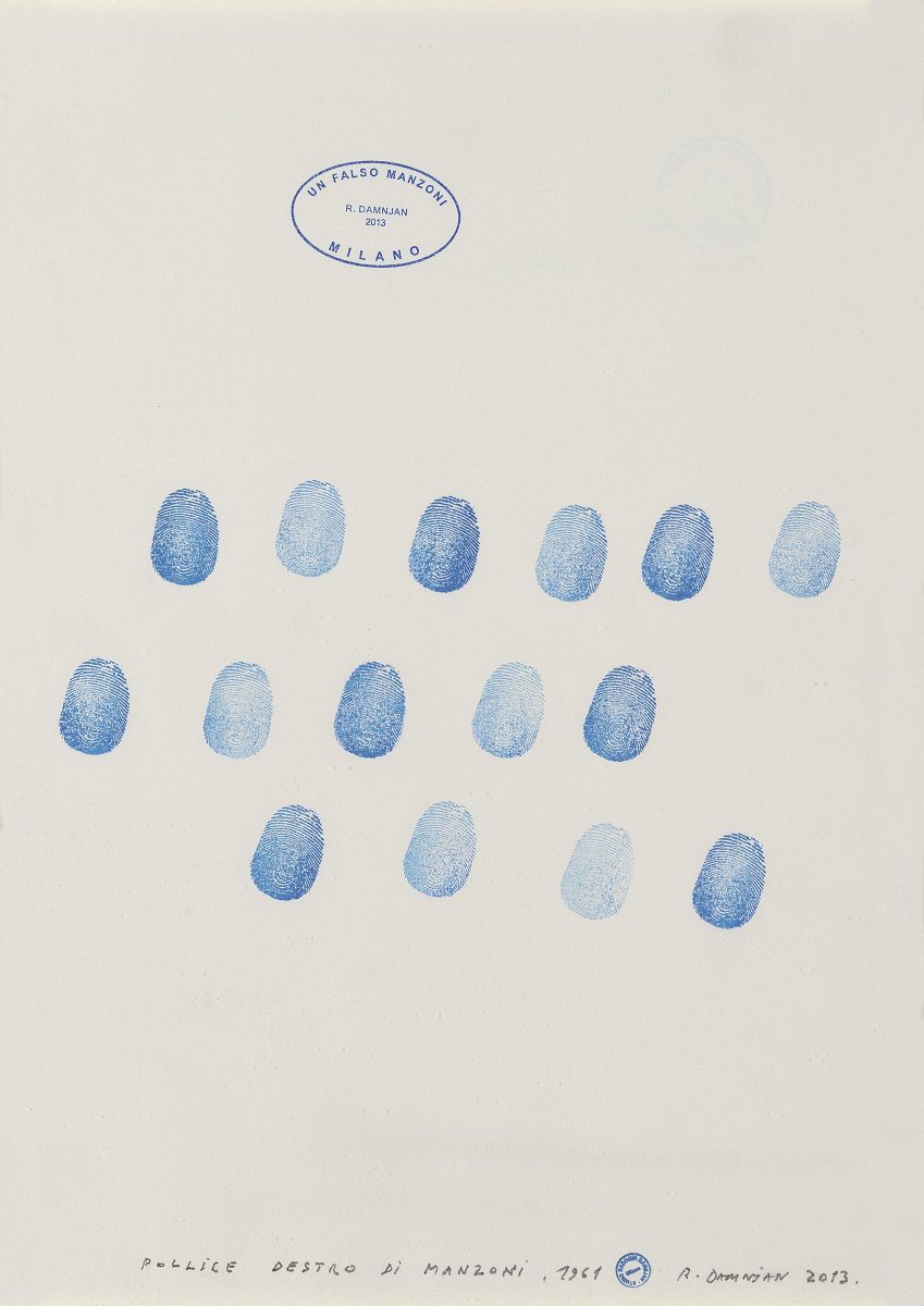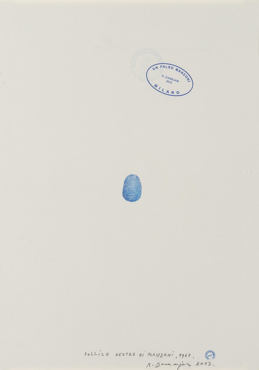 Damnjan je radove overene autorskim pečatom s natpisom Un falso Manzoni izveo po fotografijama objavljenim u katalogu Manconijeve retrospektive u Milanu 2014, ali je za ovog italijanskog umetnika znao znatno pre, između ostalog zahvaljujući kontaktima sa pojedinim pripadnicima grupe Gorgona na čiji je poziv Damnjan u Zagrebu juna 1962. priredio samostalnu izložbu popraćenu tekstom Matka Meštrovića u skromnom katalogu-pozivnici. Nedugo pre ovog događaja, Manconi je za svoj nažalost nerealizovani autorski broj anti-časopisa Gorgona pripremio tri predloga pod istovetnim nazivom Tavole di accertamento i to pod 1. sa slovima abecede, 2. sa otiscima palca, 3. sa linijom. Postoji, dakle, ceo niz podataka koji – posle više od pola veka – podsećaju na postojanje direktnih ili indirektnih relacija u trouglu Manconi-Gorgona-Damnjan, podstaknutih događajima u Zagrebu početkom šezdesetih godina prošlog veka. Možda čak Damnjanov rad Un falso Manzoni duguje svoju polaznu ideju ovim davnim ali i do danas još uvek nezaboravljenim okolnostima.