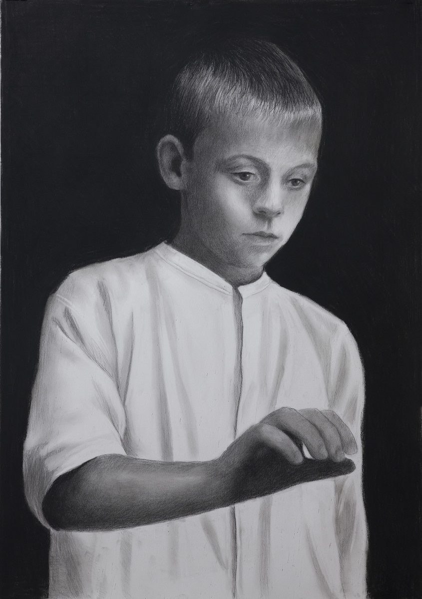Većina novih crteža Saše Marjanovića u dijalogu je sa filmom Bela traka Mihaela Hanekea. Čudni i tajanstveni događaji u malom selu na severu protestantske Nemačke, u vreme pred Veliki rat, gde svako kao da ima neku svoju tajnu, uvode nas u film u kojem se smenjuju i prepliću priče o nasilju roditelja nad decom, dece nad drugom decom, i društva nad pojedincem. Nasilje nije uvek lako vidljivo, nekada se maskira u brigu za dobro vaspitanje, na primer, ali to ne znači da je ono tada manje opasno i da manje štete nanosi. Autor ovog filma pod lupu stavlja dogme hrišćanskog vaspitanja, koje sa jedne strane podrazumeva strogost i nepopustljivost vaspitača, a pokornost i slepu poslušnost dece sa druge strane. Film sugeriše i to da se žrtve vrlo lako preobraćaju u dželate. I da kazne duševno oštećuju i one koji ih sprovode i one koji moraju da ih trpe. U središtu pažnje ovog Hanekeovog filma su nimalo slučajno – deca. Ona trpe kazne, od njih se traži da se prilagode kolektivu i odreknu prava na različitost, individualnost, kreativnost. Deca moraju da sputaju sopstvenu seksualnost i da se odreknu spontanog izražavanja svojih osećanja. Od dece se zahteva uniformnost, traži se da na svoja lica stave socijalno prihvatljive maske. Kao posledica toga, ti mali ljudi počinju sve više toga u sebi da potiskuju. I upravo ta tamna i potisnuta strana ličnosti, a nju otkrivamo i kod odraslih, jeste ono što predstavlja istinsku pretnju. S druge strane i odrasli, koji dosledno insistiraju na disciplini i poštovanju pravila, lako će sve to da zaobiđu samo ako im je to u neposrednom životnom interesu. Svet u kojem cvetaju surovost i nasilje istovremeno je i svet u kojem vladaju licemerje i laži. Ova dva sveta i ne idu jedan bez drugog.