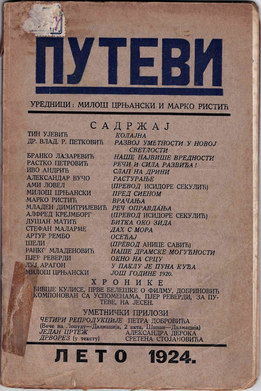 Već 1923. godine, u prvom broju nove serije Puteva, koja je izlazila po uzoru na francuski Littérature, objavljen je prevod odlomaka iz Bretonovih eseja (Clairement, Marcel Duchamp, Les Mots sans rides) i Židovih Stranica iz Lakfadijevog dnevnika, a Matićevim tekstom O Freudovoj psihoanalizi nazirao se pravac u kojem će se potonja avangardna misao razvijati. Iako u osnovi modernistički časopis, poetska i prozna ostvarenja Marka Ristića, Aleksandra Vuča, Milana Dedinca i Dušana Matića davala su mu novi, radikalan ton, a tekst Bitka oko zida u poslednjem trobroju najavio je njihovo konačno nadrealističko opredeljenje. Krajem 1924. godine u Parizu je objavljen Manifest nadrealizma, a ubrzo je izašao i prvi broj časopisa La Révolution Surréaliste (Nadrealistička revolucija, 1924-1929), kojem je u Beogradu odgovaralo pokretanje časopisa Svedočanstva (1924-1925). U prvom broju objavljen je tekst Nadrealizam Marka Ristića, sa definicijom i objašnjenjem ideja iz Manifesta. Period do osnivanja zvanične beogradske grupe ogleda se u plodnom individualnom radu. Utom izlazi i najznačajnije poetsko ostvarenje srpskog nadrealizma – poema Javna ptica Milana Dedinca, kao i Ristićev anti-roman Bez mere.